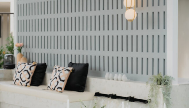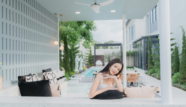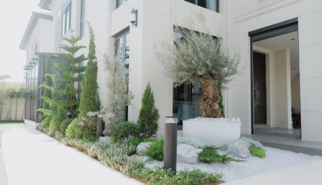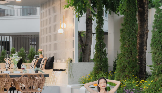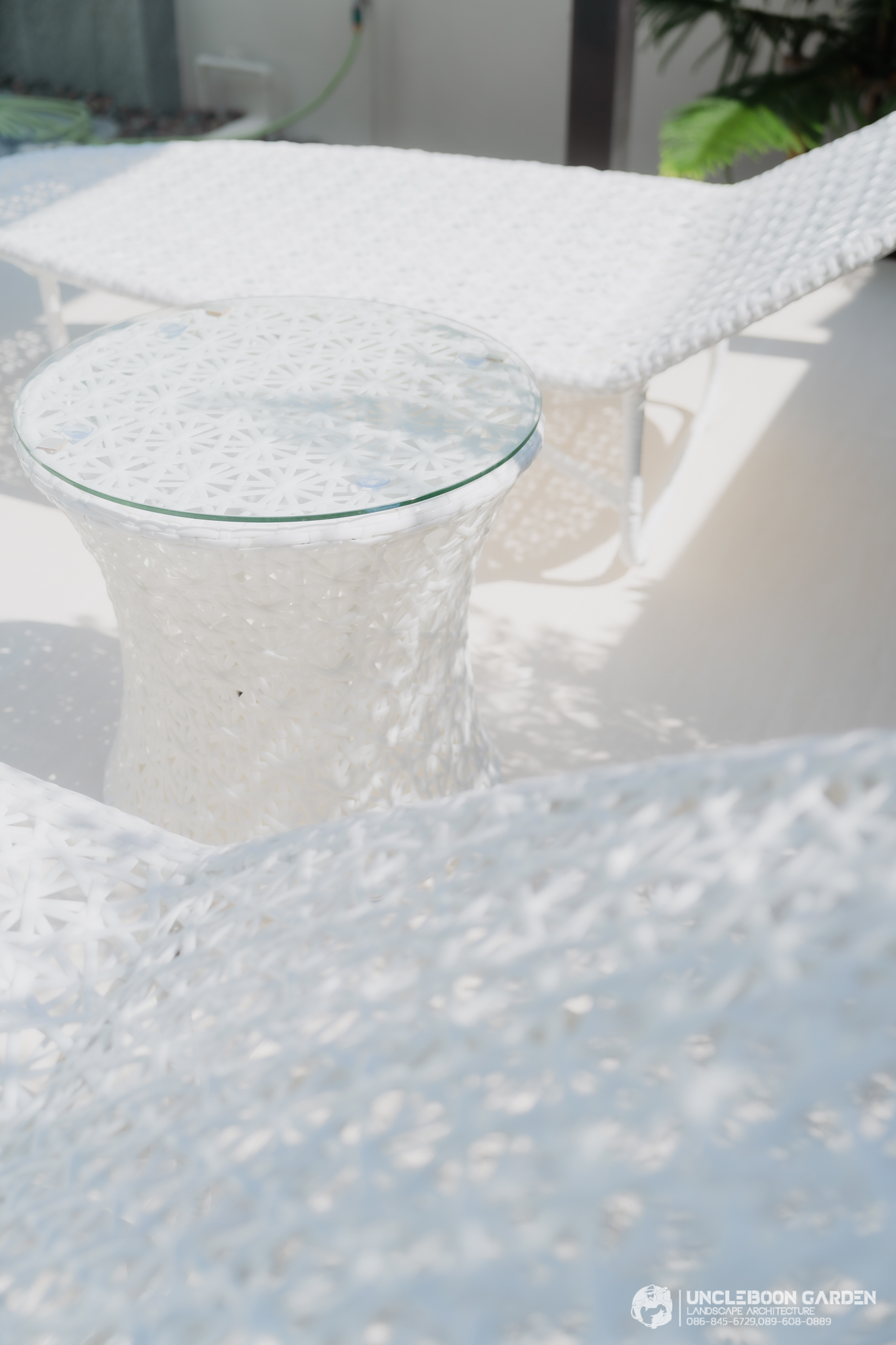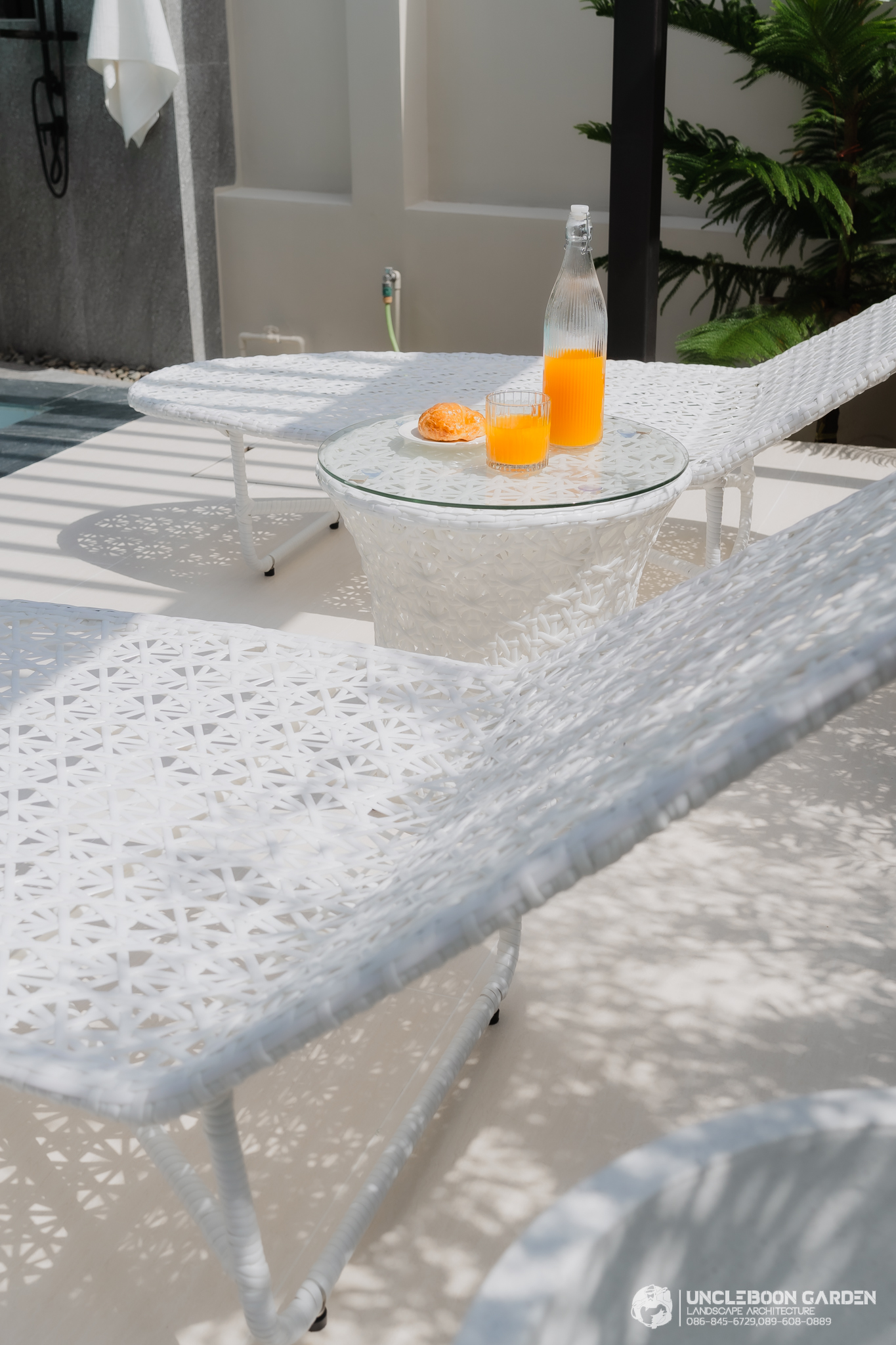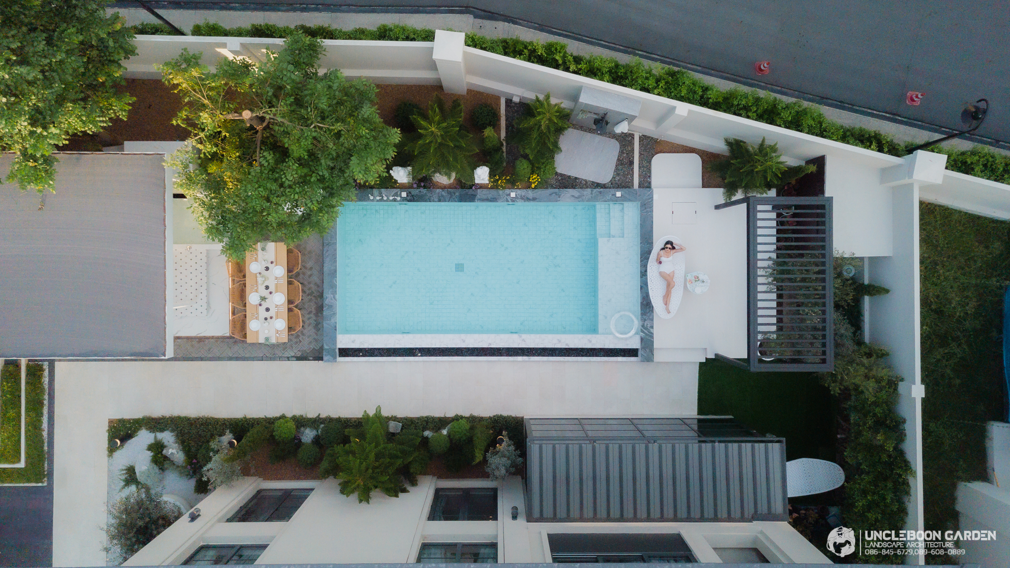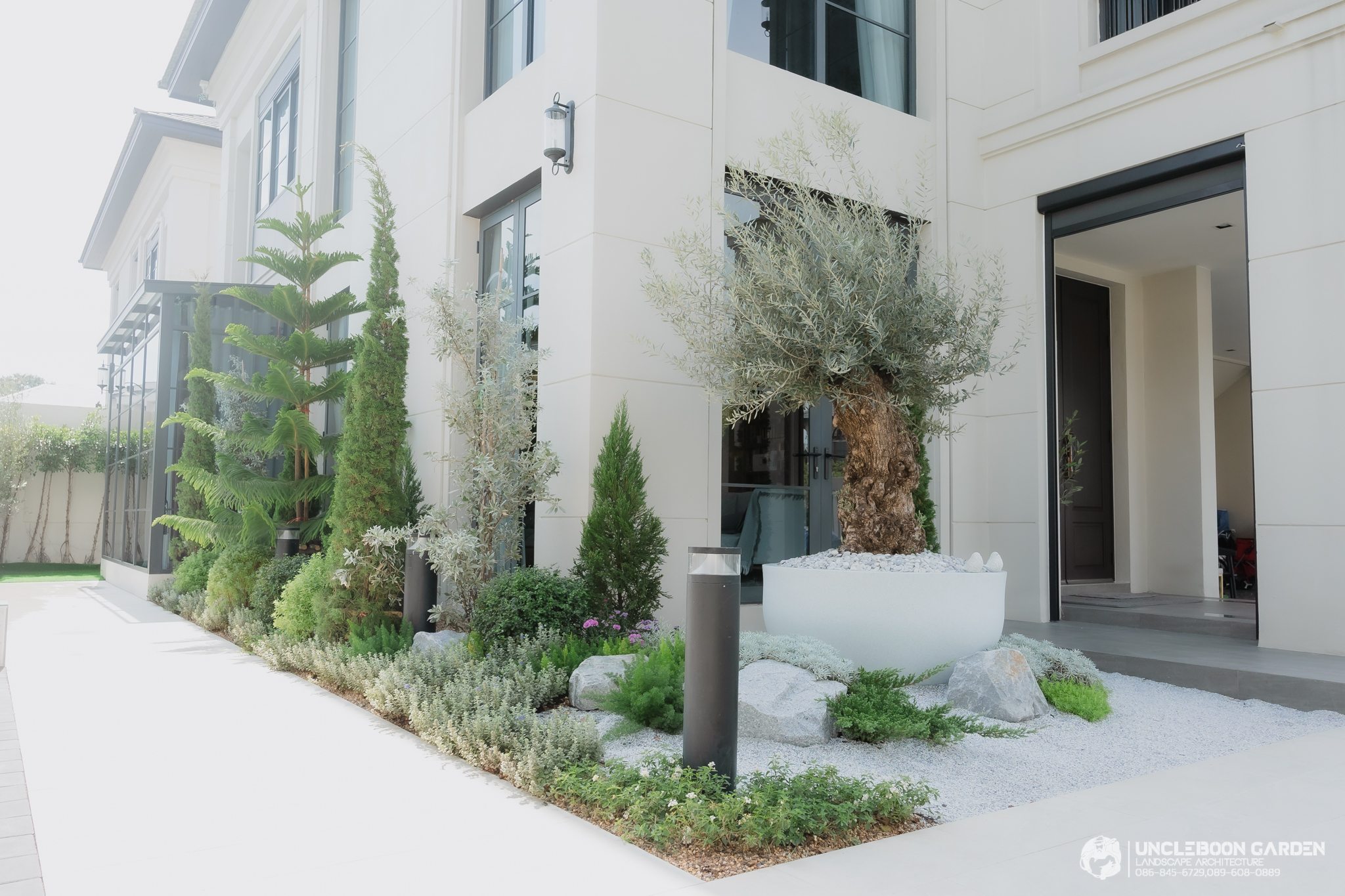 การเลือกพรรณไม้เน้นโทนสีเย็นและไม้ใบละเอียด เช่น ไม้พุ่มตัดแต่ง และ ไม้ดอกสีอ่อน เพื่อสร้าง aesthetic balance และเสริมความนุ่มนวลให้พื้นที่ การจัดวางพื้นที่ใช้ zoning principles ที่ชัดเจน โดยเพิ่มมุมพักผ่อนและพื้นที่ใช้งานที่หลากหลาย