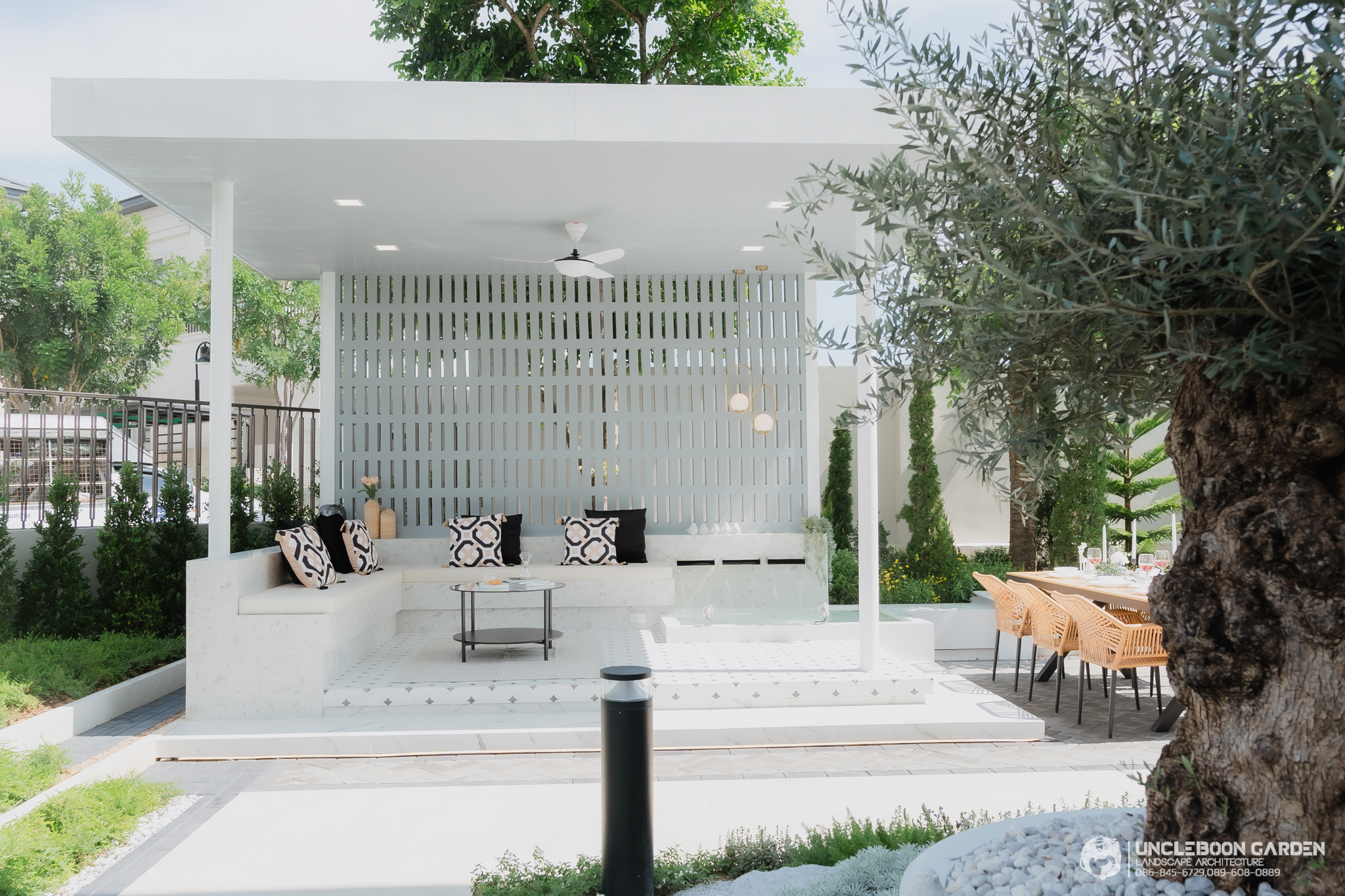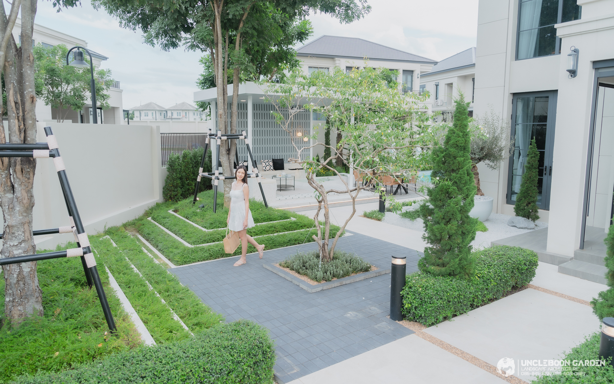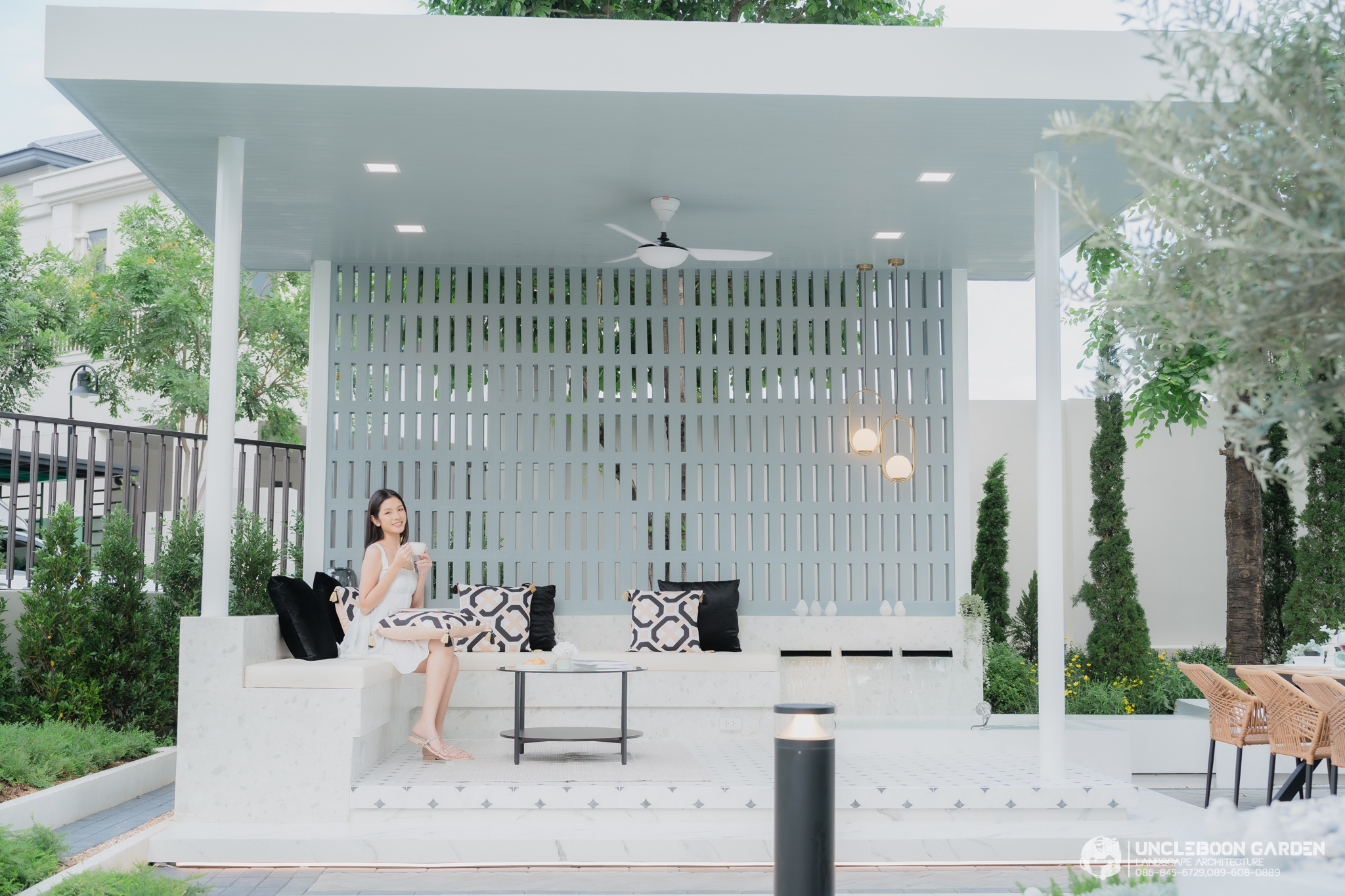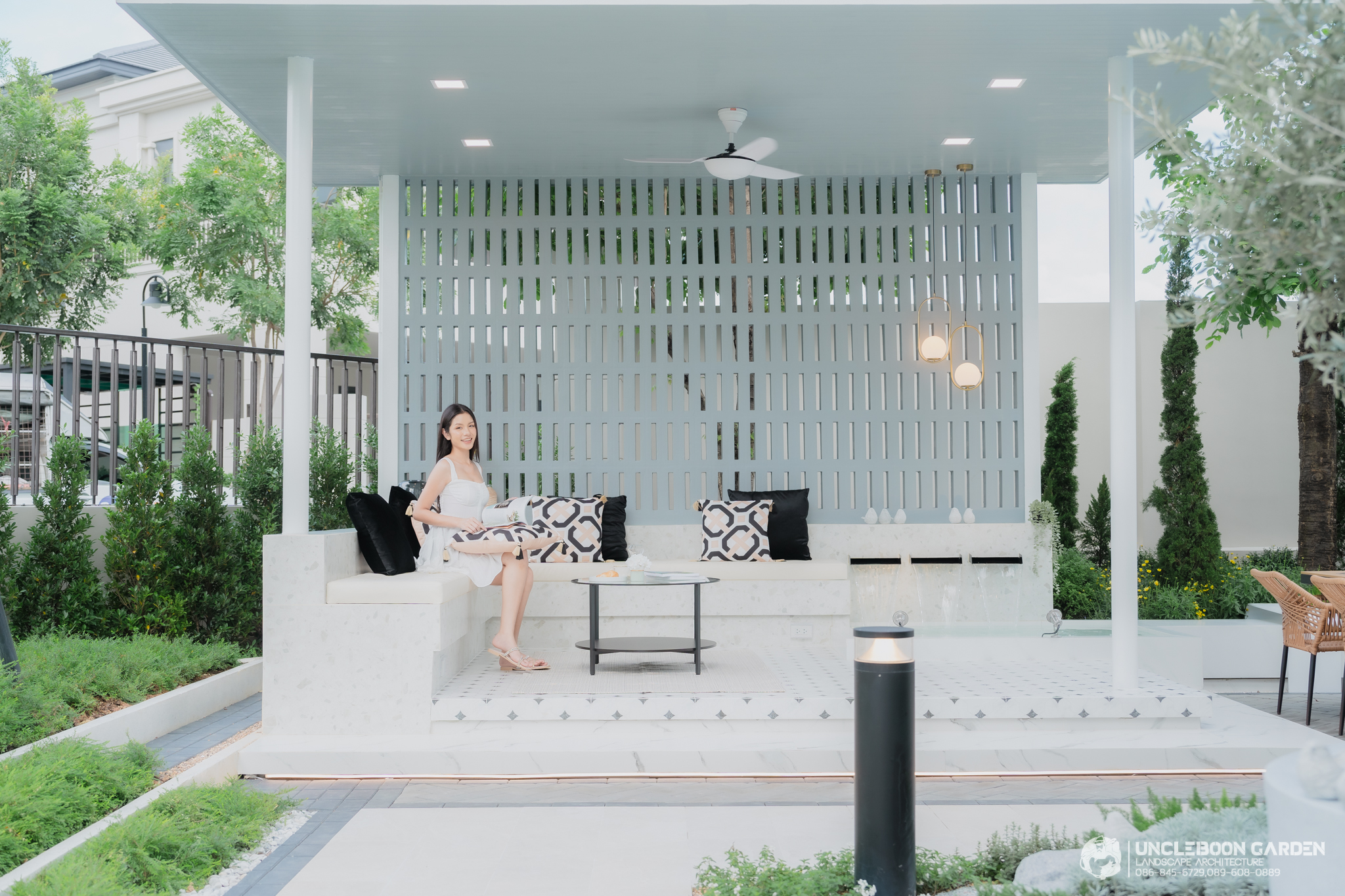 ผู้ออกแบบได้ผสมผสานแนวคิดของ English Modern Garden เข้ากับงานภูมิสถาปัตยกรรม เกิดเป็นพื้นที่ที่สะท้อนกลิ่นอายของ English Garden รายละเอียดสำคัญ ได้แก่ ศาลาโครงสร้างโปร่งโล่ง (open-frame pavilion) ซึ่งออกแบบตามหลัก spatial efficiency และ functional aesthetics ช่วยสร้างจุดเด่นที่เพิ่มความสวยงามและการใช้งานพื้นที่อย่างลงตัว