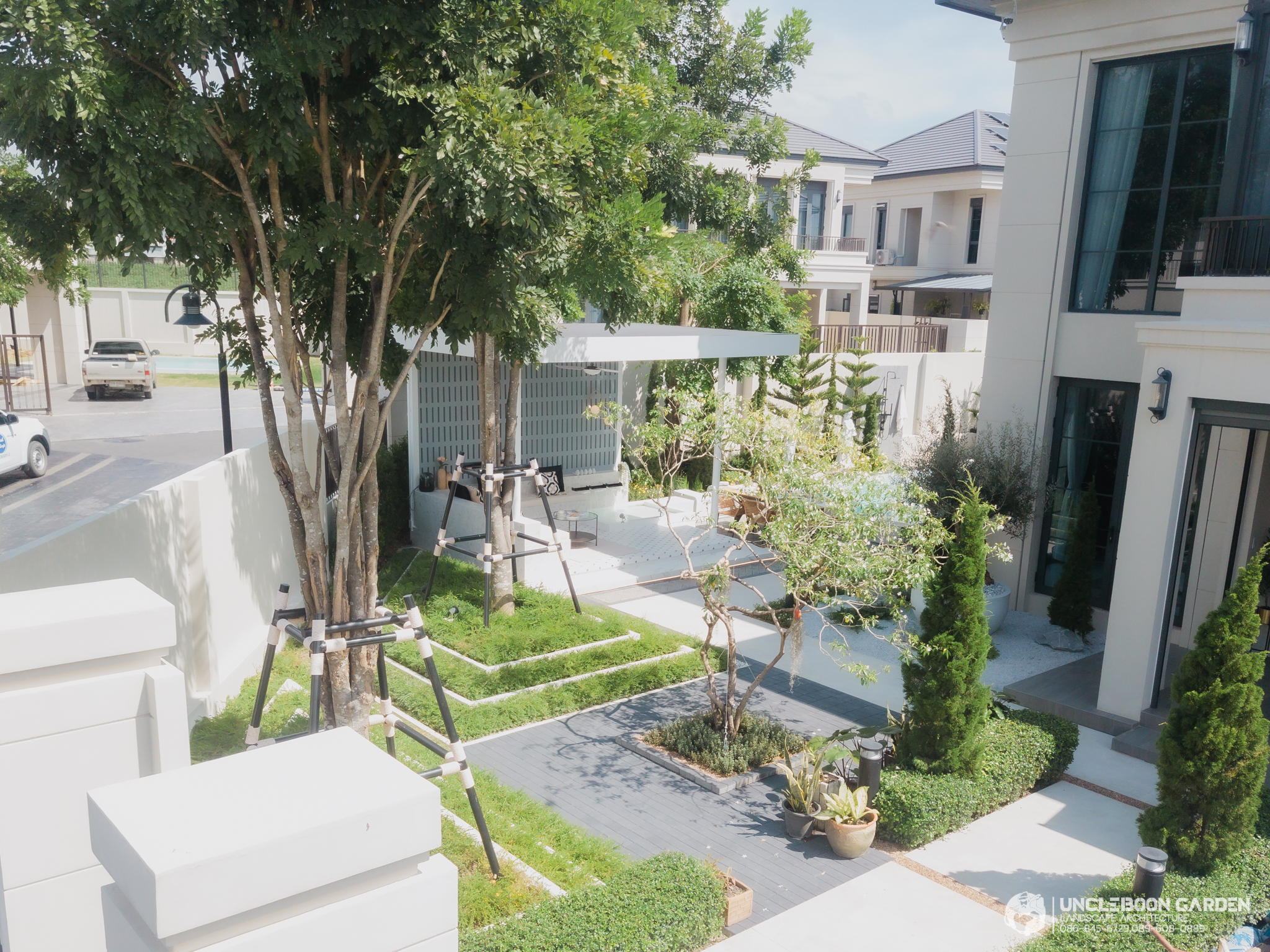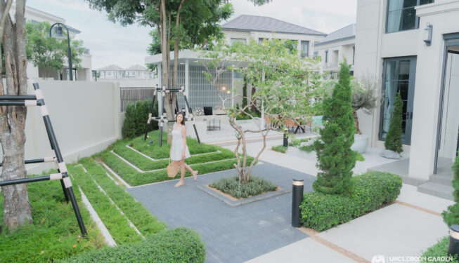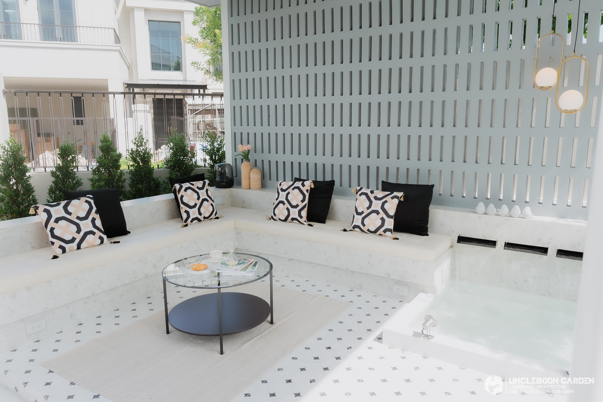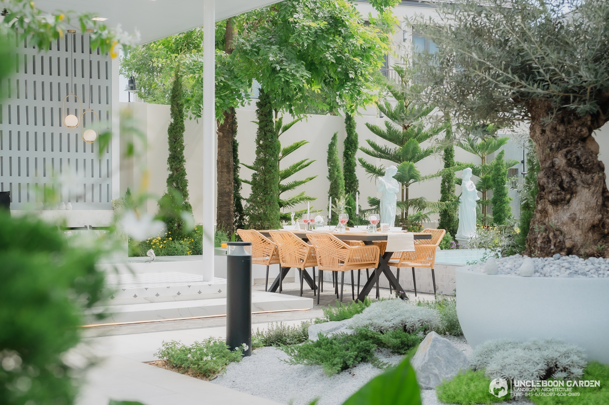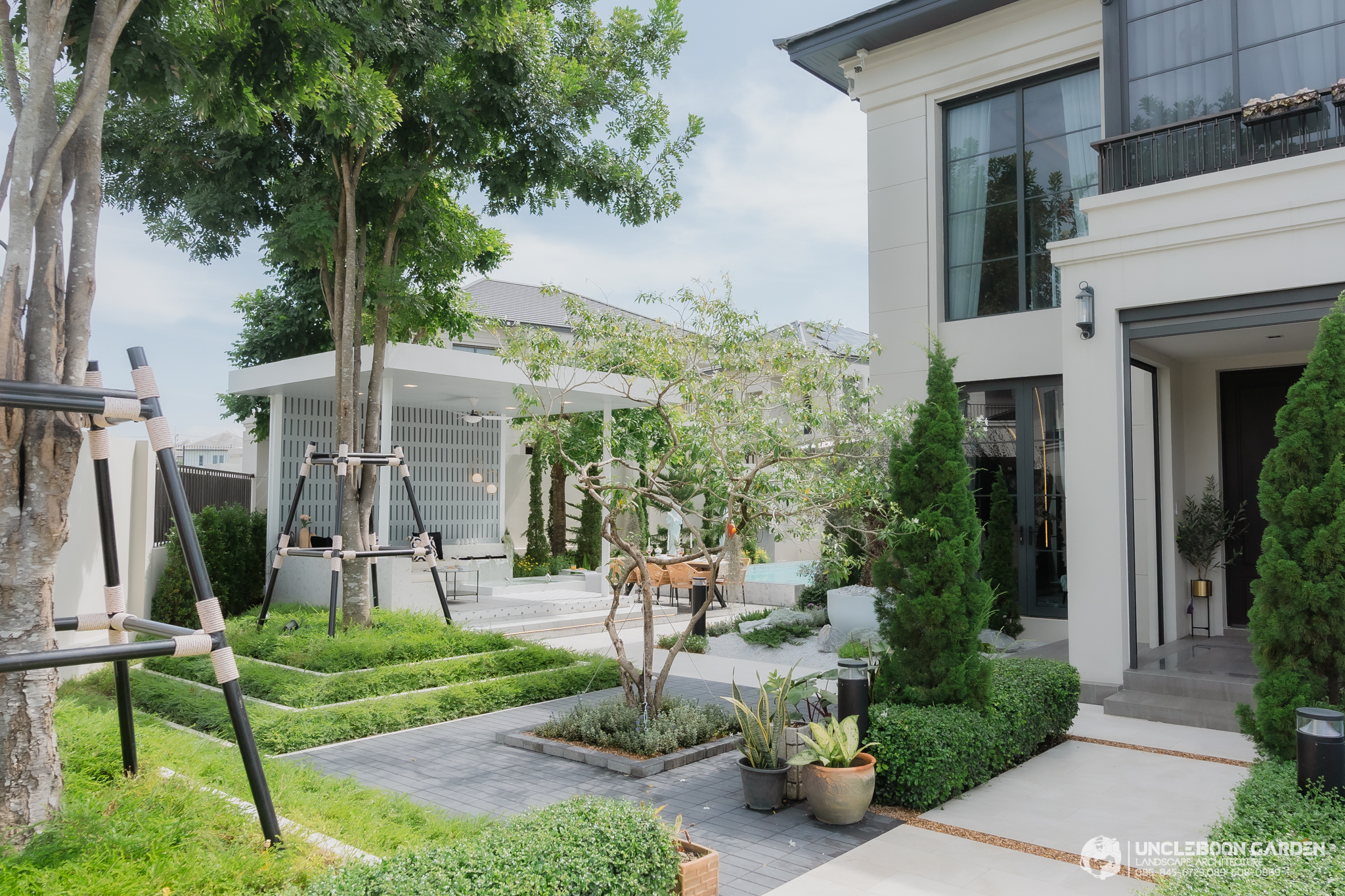 ผู้ออกแบบได้ผสมผสานแนวคิดของ English Modern Garden เข้ากับงานภูมิสถาปัตยกรรม เกิดเป็นพื้นที่ที่สะท้อนกลิ่นอายของ English Garden รายละเอียดสำคัญ ได้แก่ ศาลาโครงสร้างโปร่งโล่ง (open-frame pavilion) ซึ่งออกแบบตามหลัก spatial efficiency และ functional aesthetics ช่วยสร้างจุดเด่นที่เพิ่มความสวยงามและการใช้งานพื้นที่อย่างลงตัว