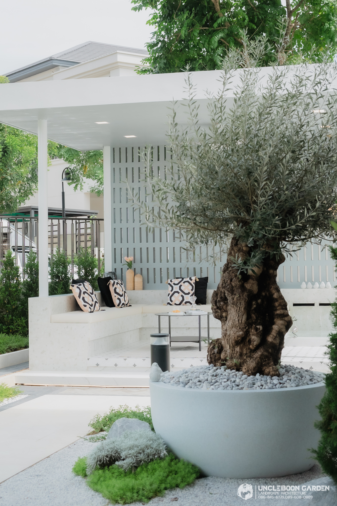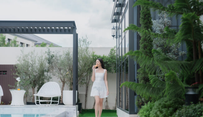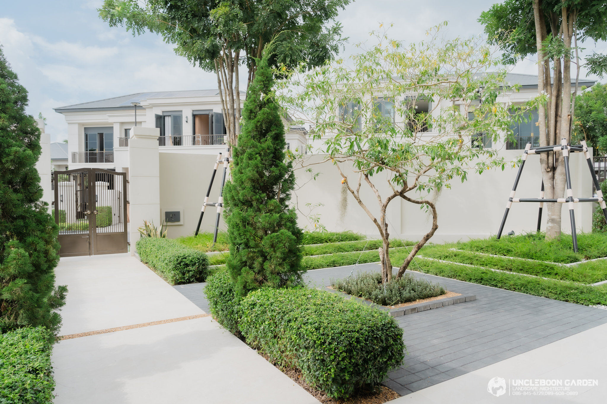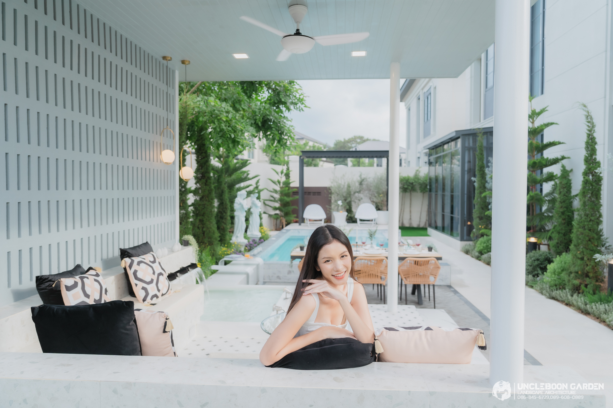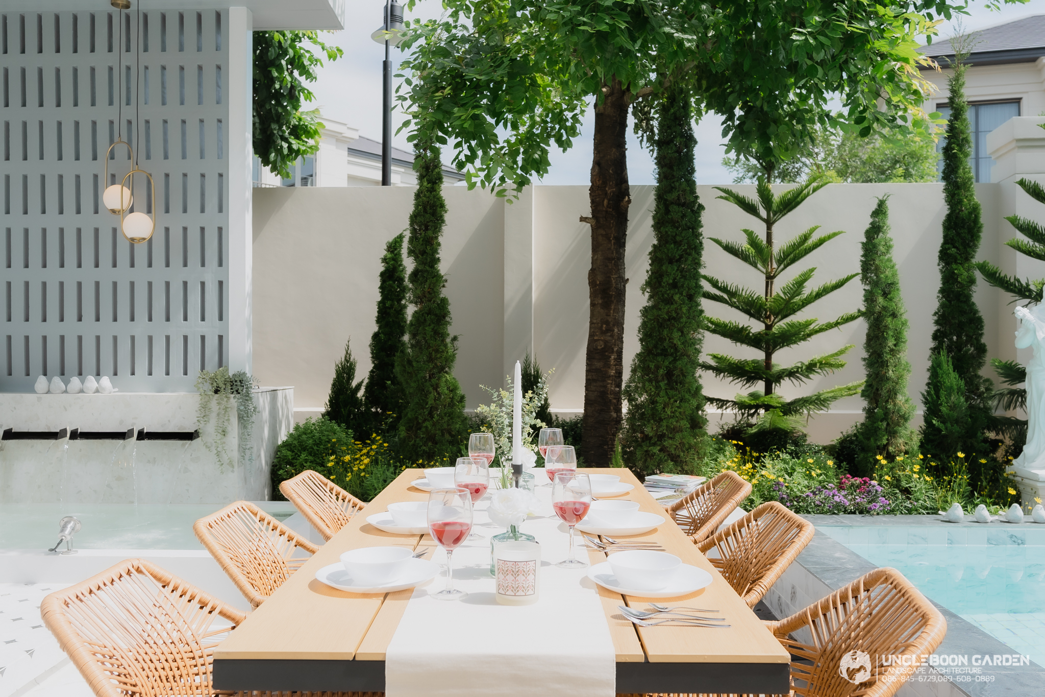 ผู้ออกแบบได้ผสมผสานแนวคิดของ English Modern Garden เข้ากับงานภูมิสถาปัตยกรรม เกิดเป็นพื้นที่ที่สะท้อนกลิ่นอายของ English Garden รายละเอียดสำคัญ ได้แก่ ศาลาโครงสร้างโปร่งโล่ง (open-frame pavilion) ซึ่งออกแบบตามหลัก spatial efficiency และ functional aesthetics ช่วยสร้างจุดเด่นที่เพิ่มความสวยงามและการใช้งานพื้นที่อย่างลงตัว