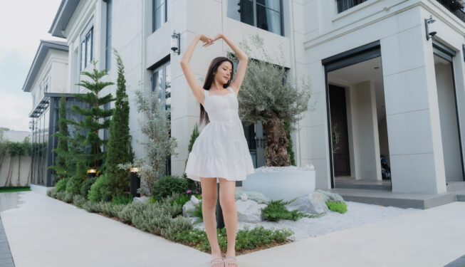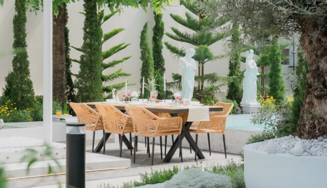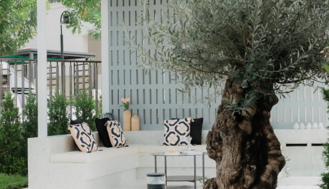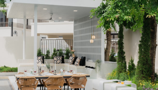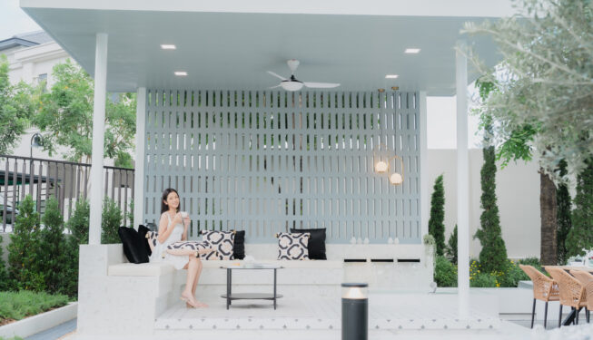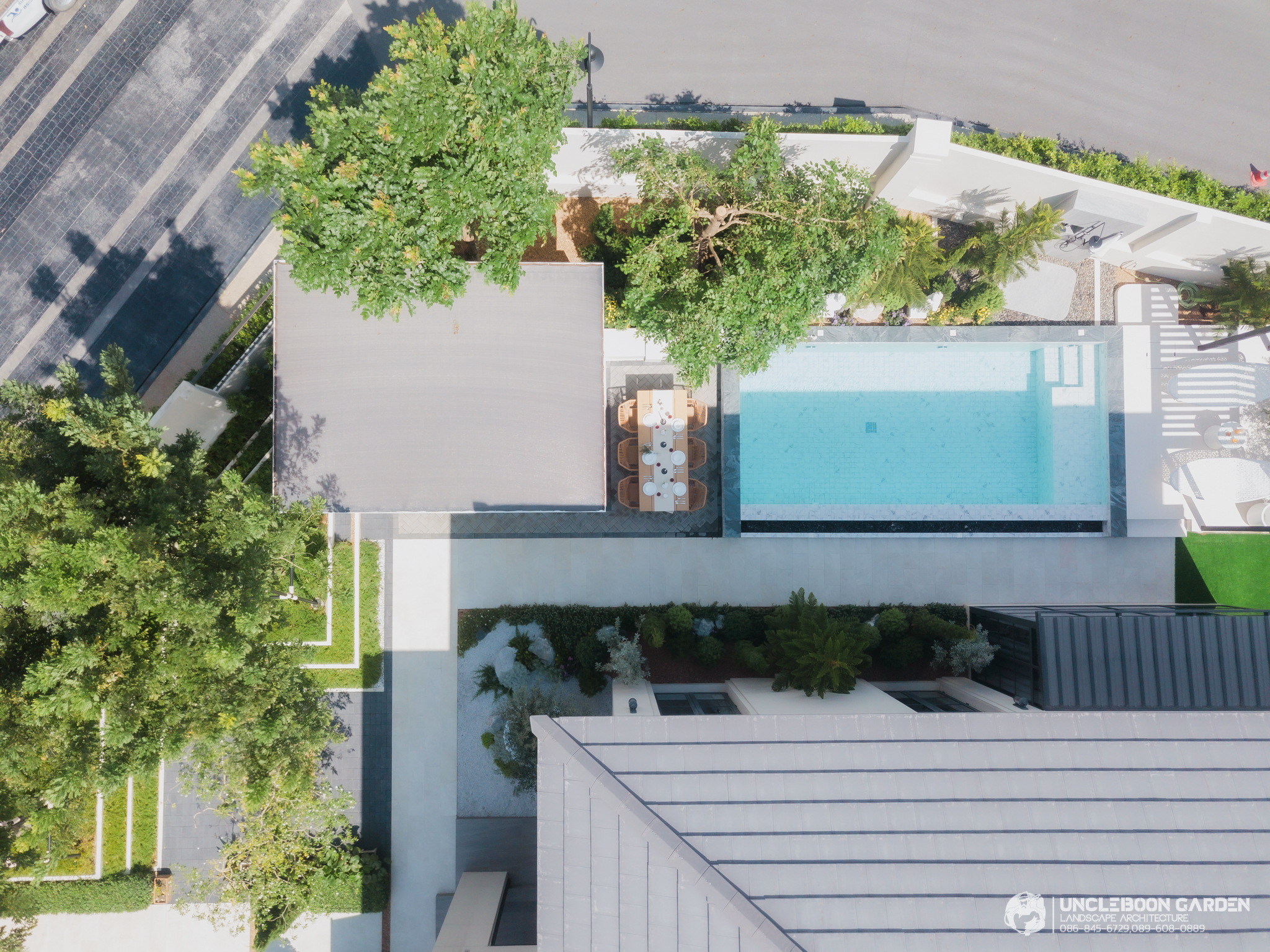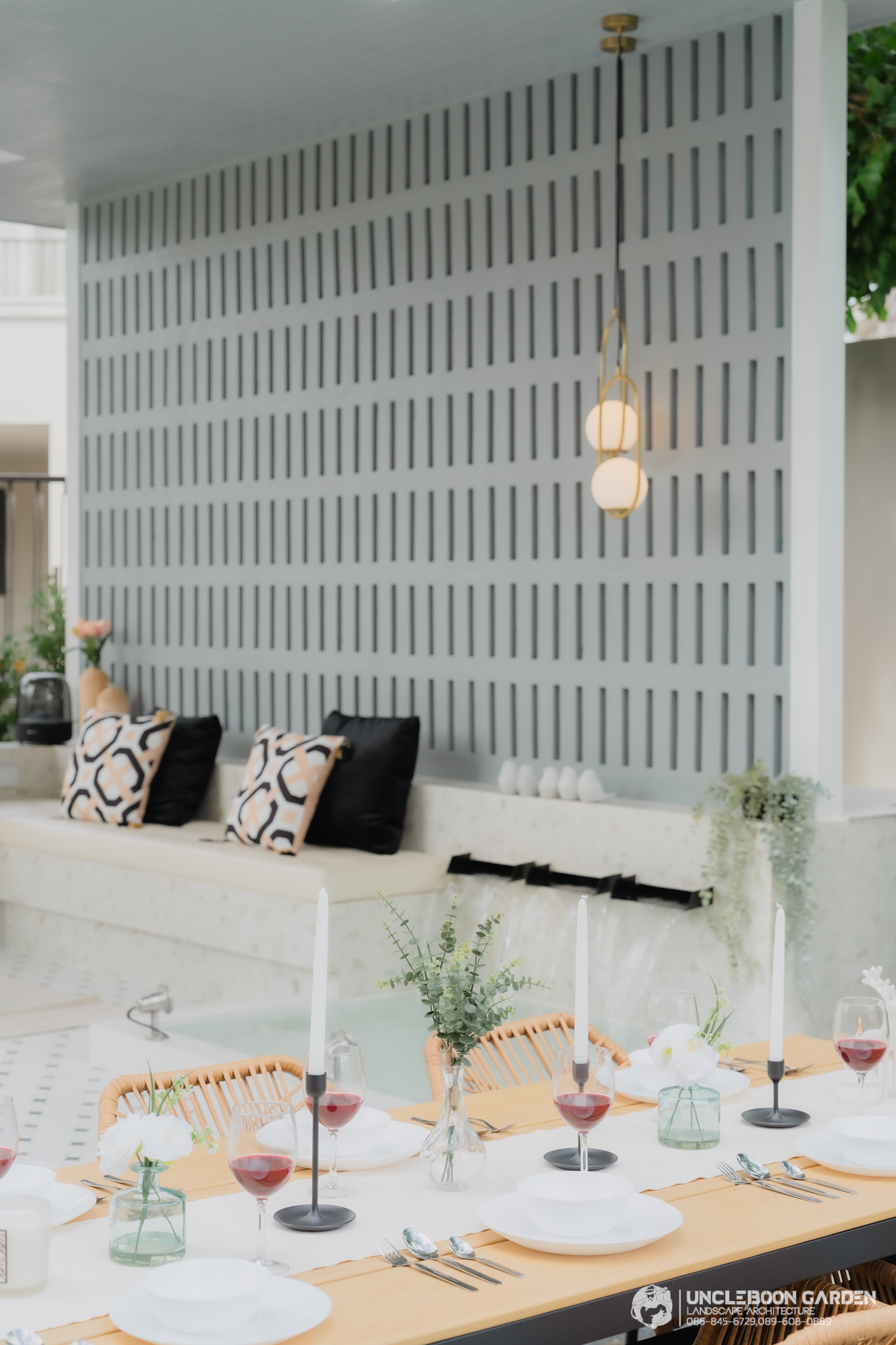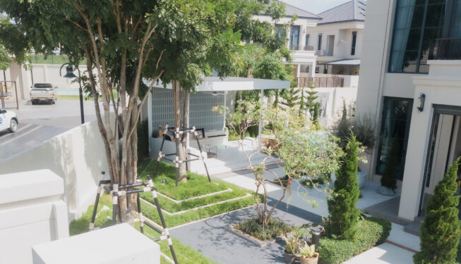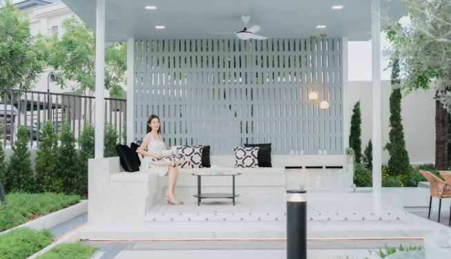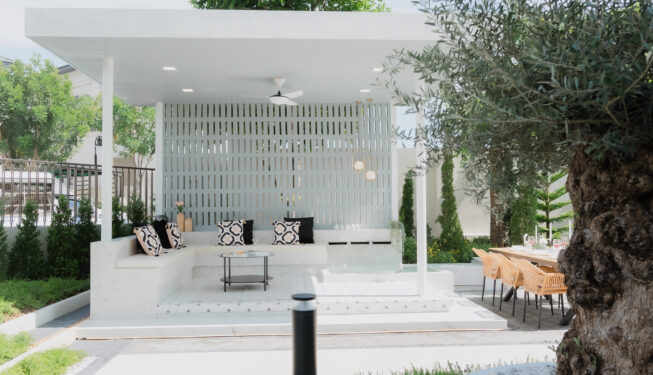 ผู้ออกแบบได้ผสมผสานแนวคิดของ English Modern Garden เข้ากับงานภูมิสถาปัตยกรรม เกิดเป็นพื้นที่ที่สะท้อนกลิ่นอายของ English Garden รายละเอียดสำคัญ ได้แก่ ศาลาโครงสร้างโปร่งโล่ง (open-frame pavilion) ซึ่งออกแบบตามหลัก spatial efficiency และ functional aesthetics ช่วยสร้างจุดเด่นที่เพิ่มความสวยงามและการใช้งานพื้นที่อย่างลงตัว