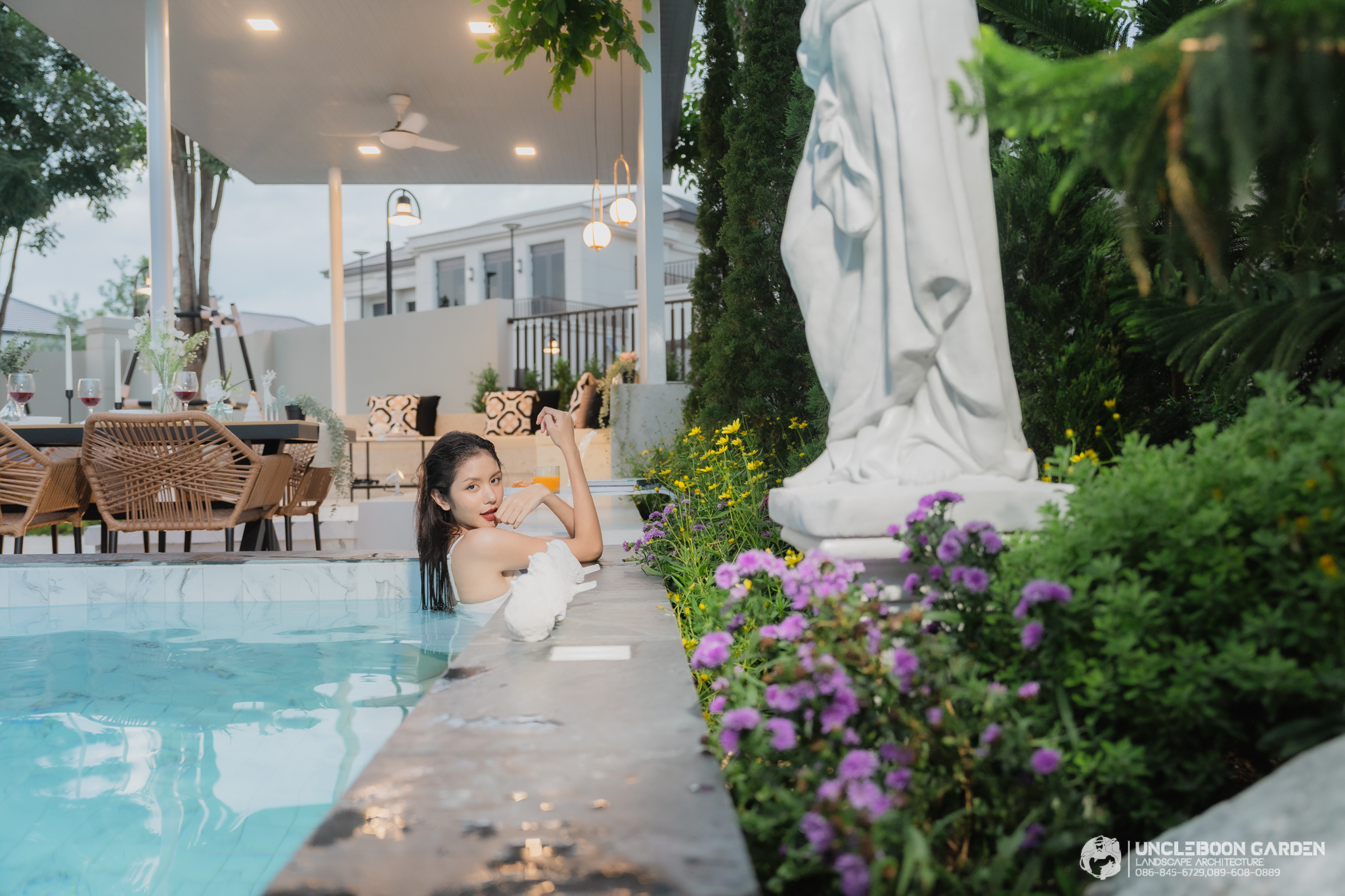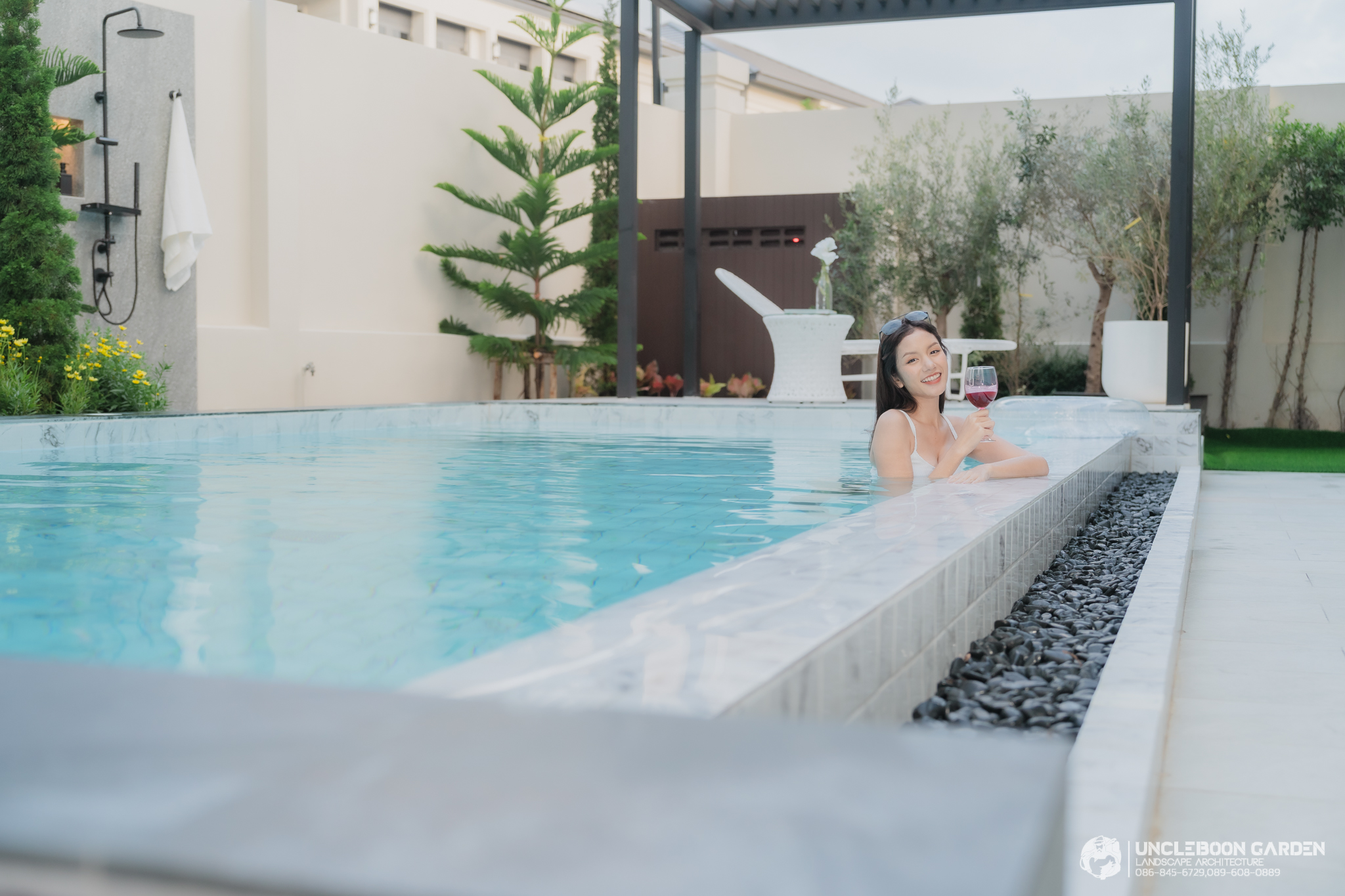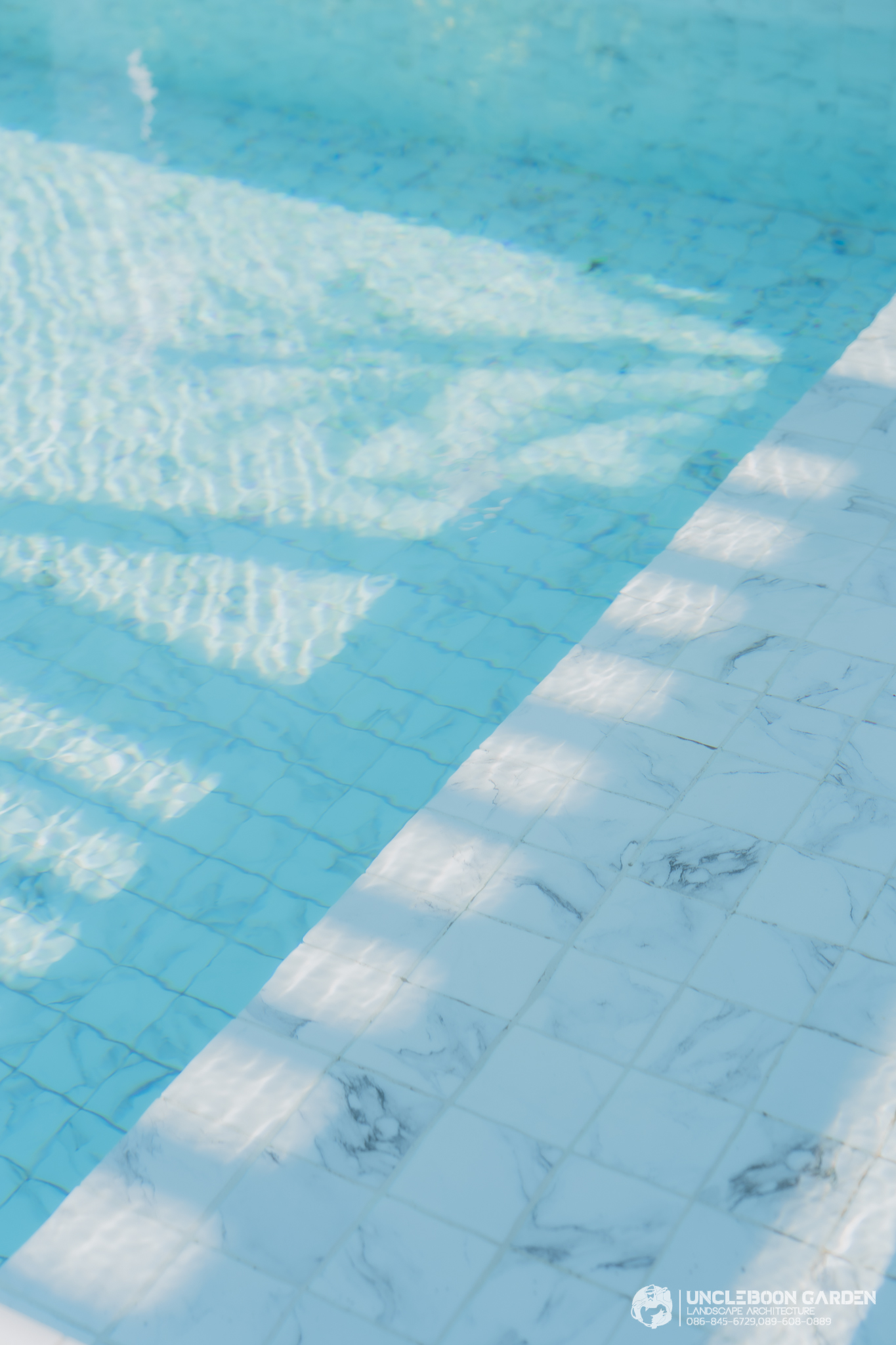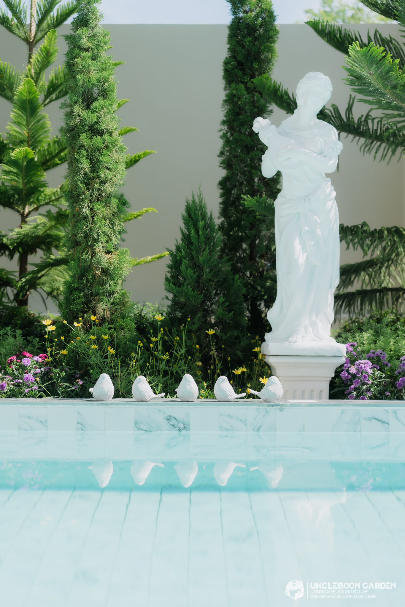 สระว่ายน้ำหินอ่อนถูกออกแบบเป็น จุดศูนย์กลางของสวน โครงสร้างใช้วัสดุหินอ่อนคุณภาพสูง เพิ่มความหรูหราและกลมกลืนกับธรรมชาติ พื้นผิวหินอ่อนสะท้อนแสงแดด สร้าง visual warmth และบรรยากาศที่ผ่อนคลาย น้ำสีฟ้าใสในสระสื่อถึง tranquility และความสงบ