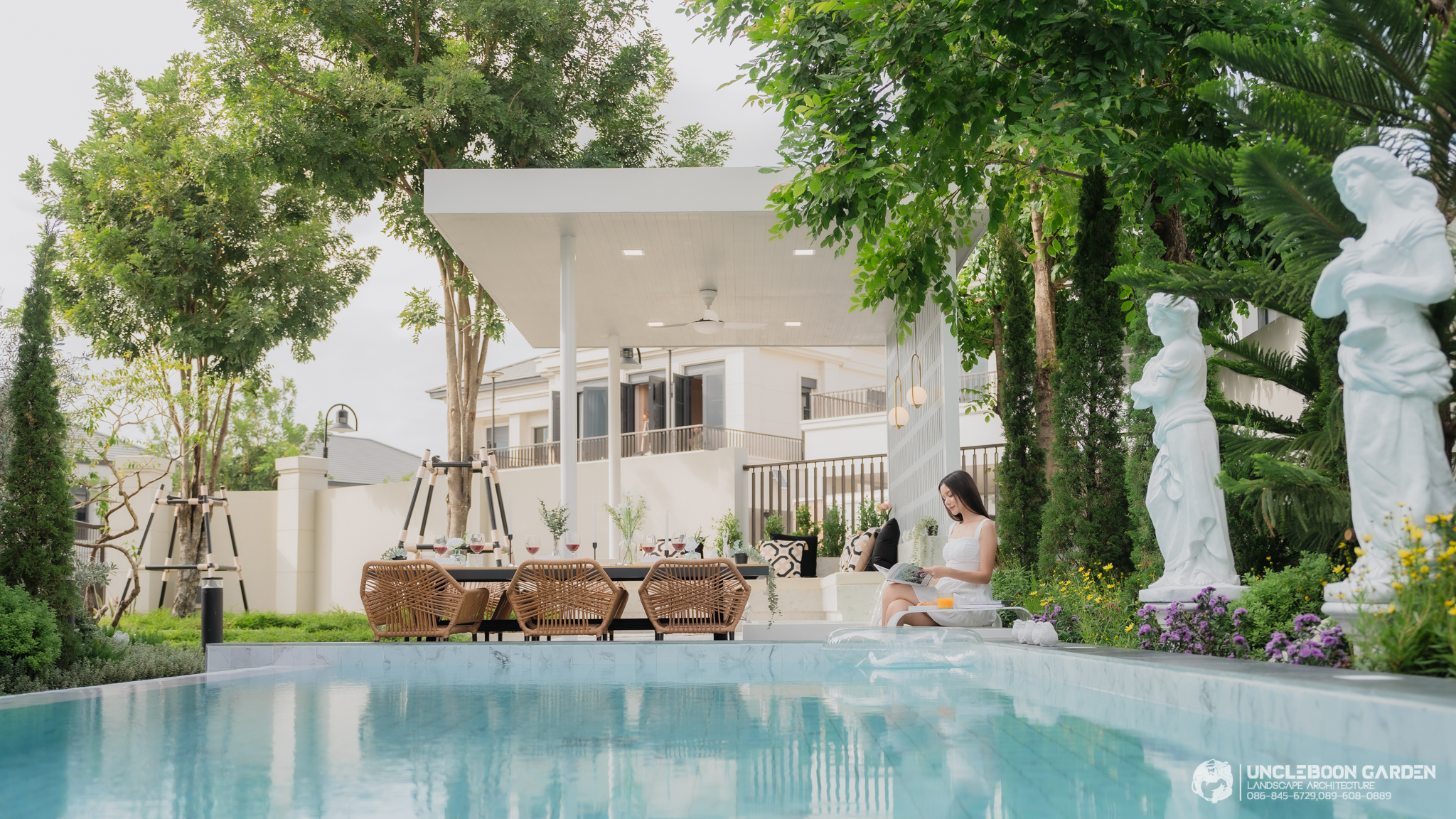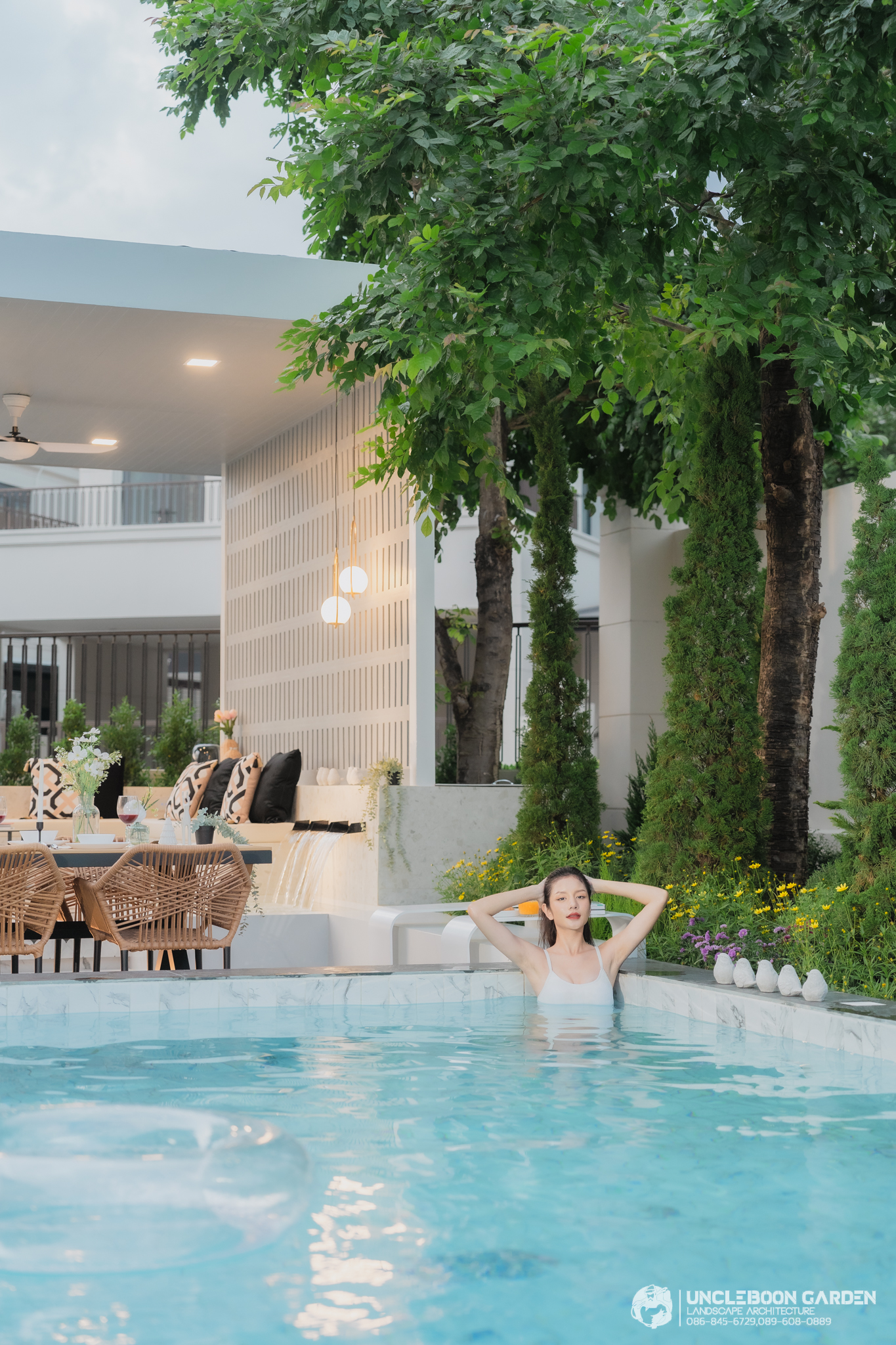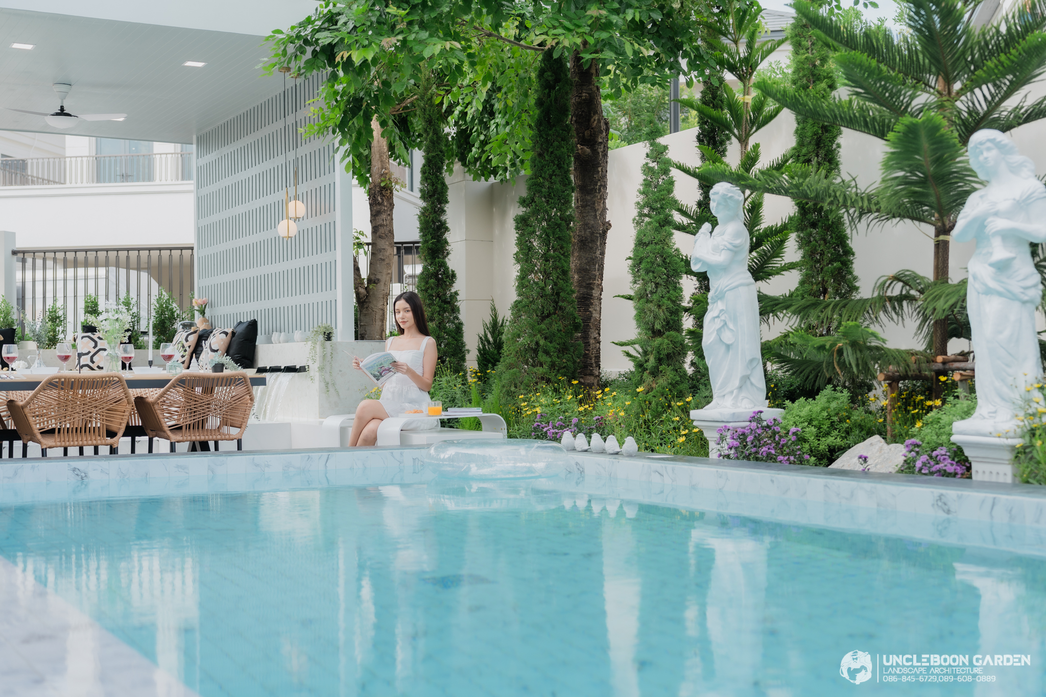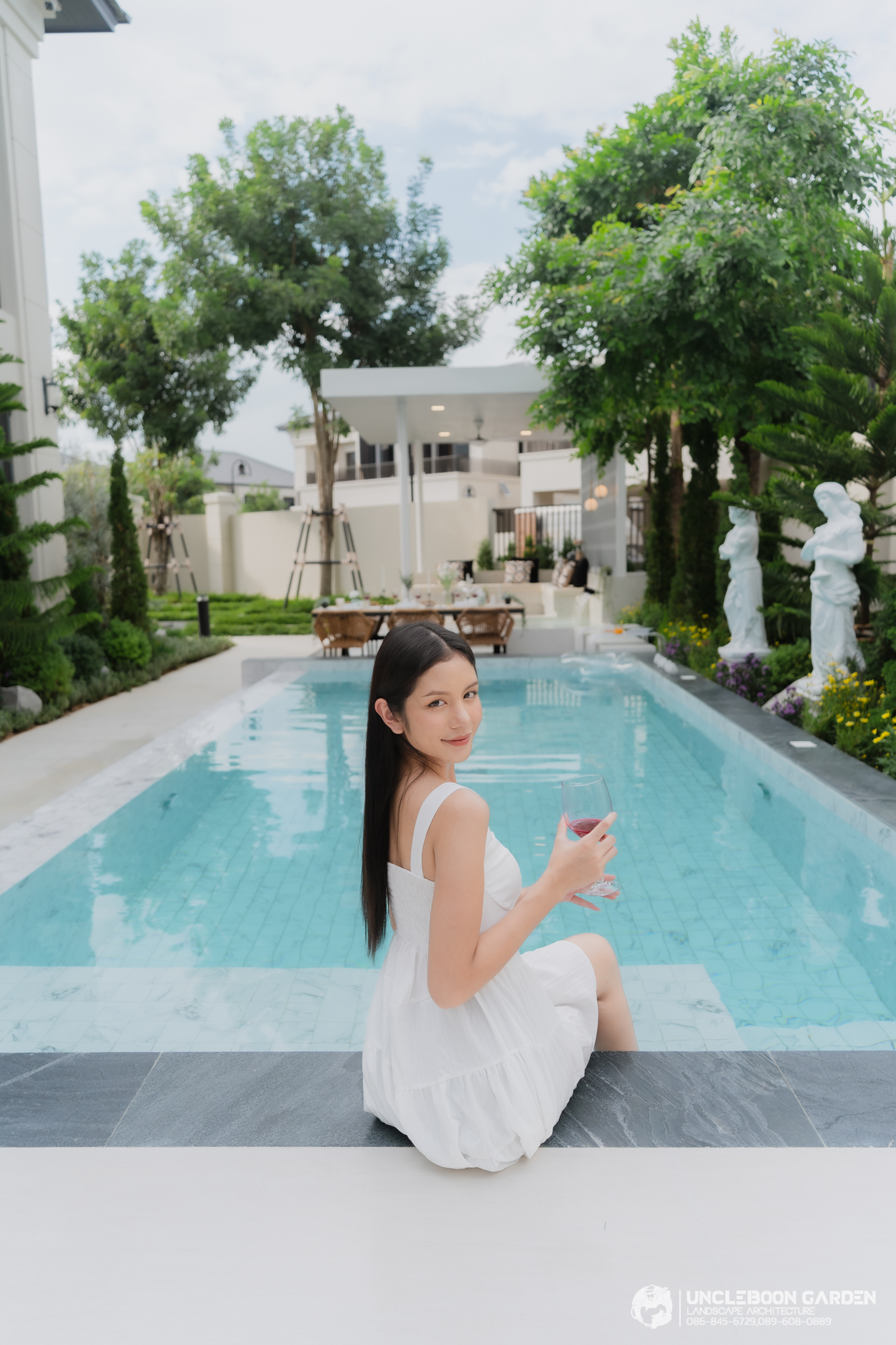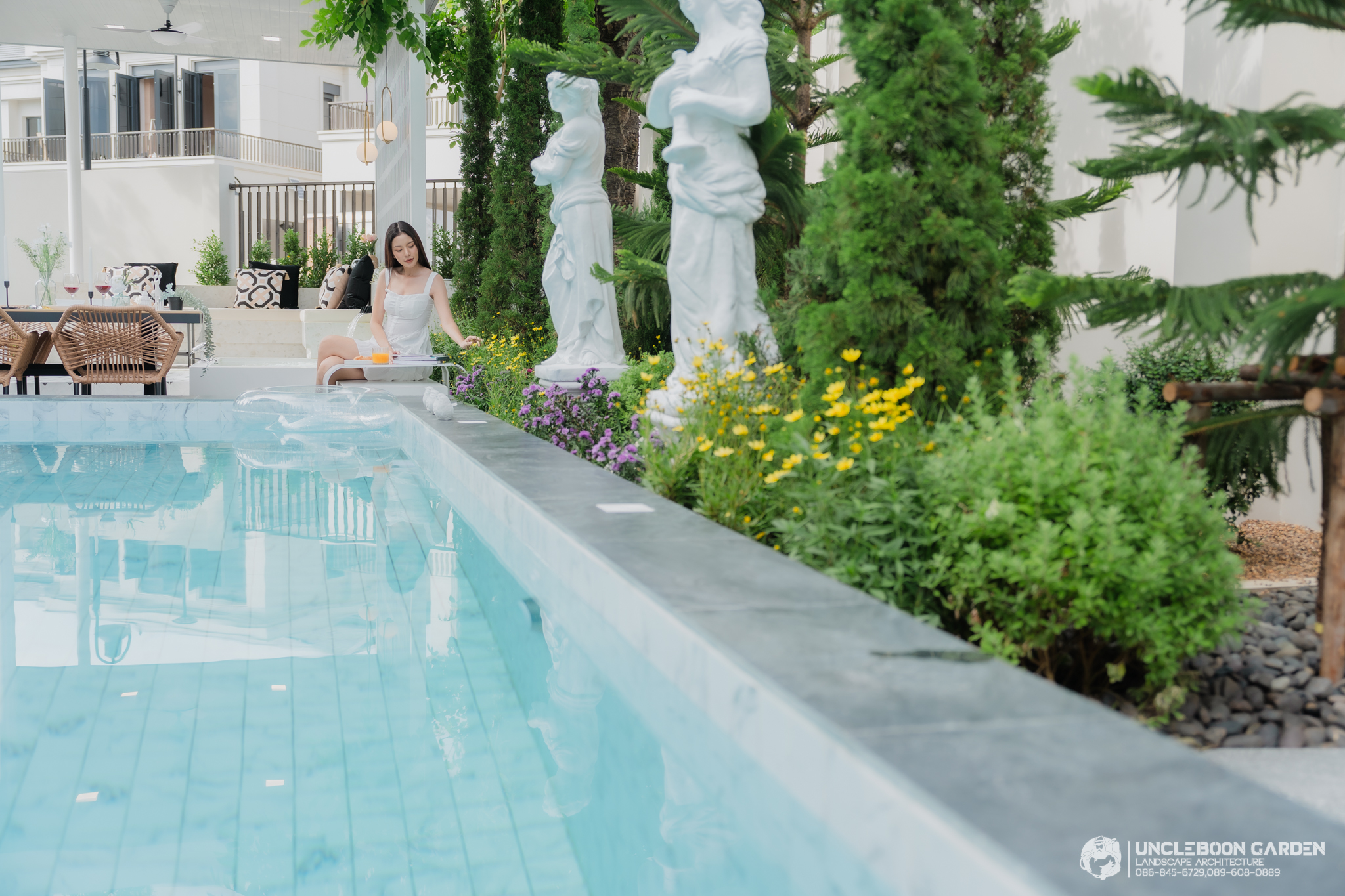 สระว่ายน้ำหินอ่อนถูกออกแบบเป็น จุดศูนย์กลางของสวน โครงสร้างใช้วัสดุหินอ่อนคุณภาพสูง เพิ่มความหรูหราและกลมกลืนกับธรรมชาติ พื้นผิวหินอ่อนสะท้อนแสงแดด สร้าง visual warmth และบรรยากาศที่ผ่อนคลาย น้ำสีฟ้าใสในสระสื่อถึง tranquility และความสงบ