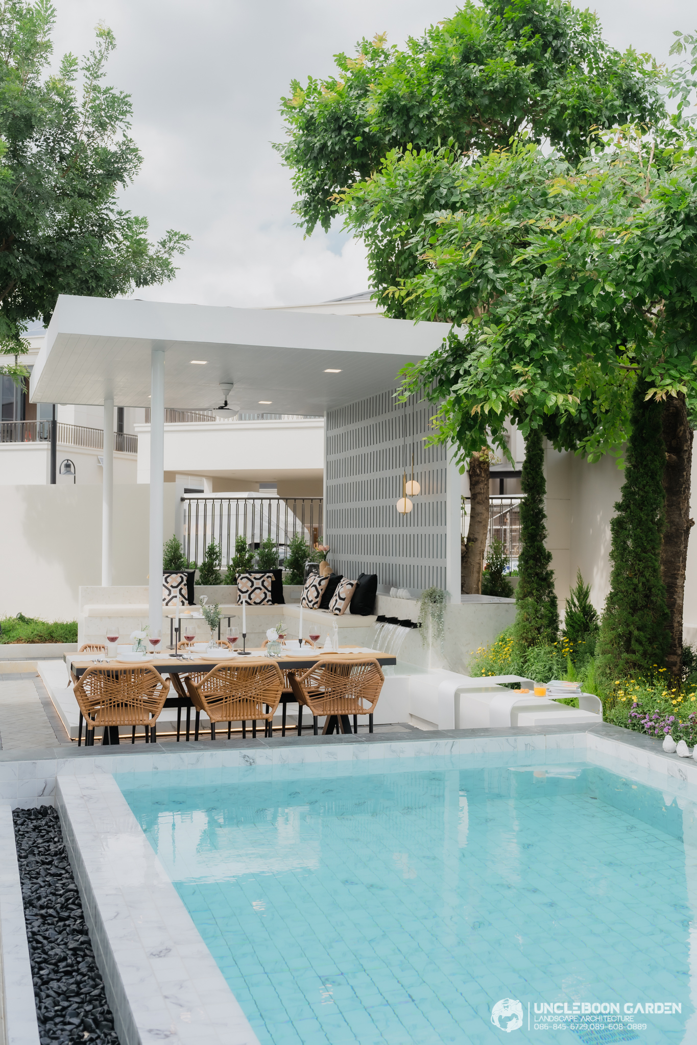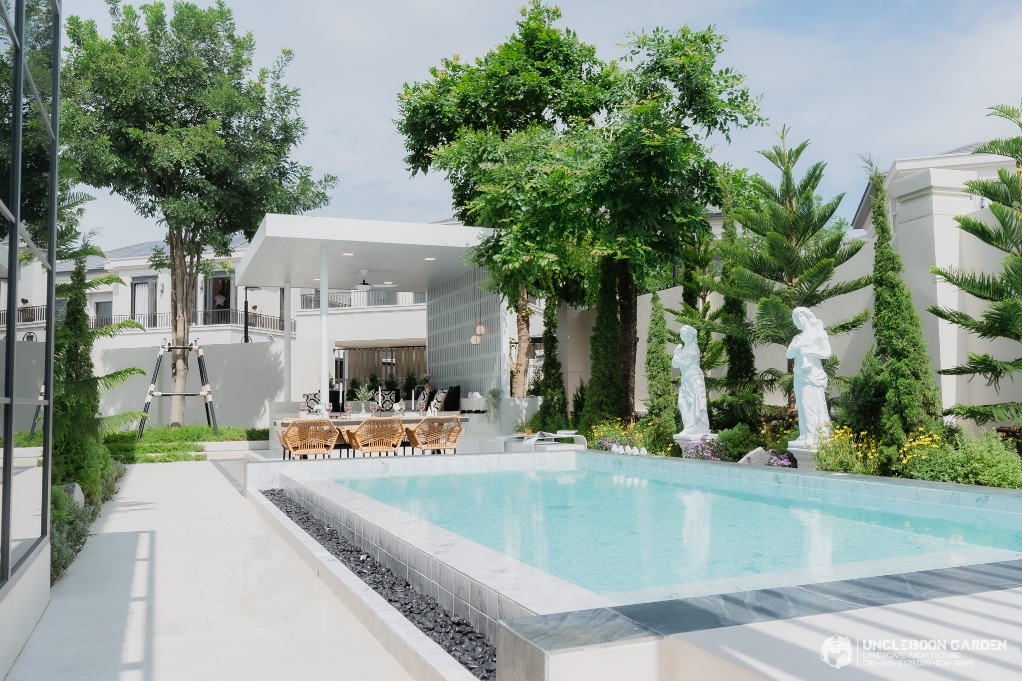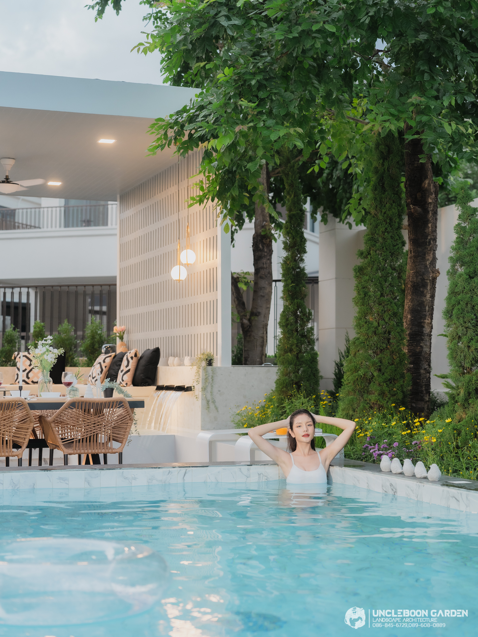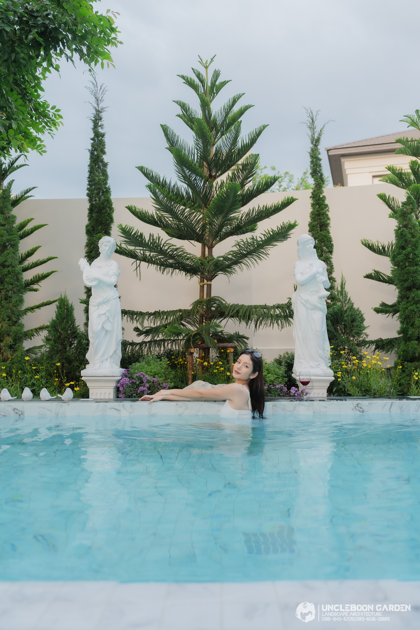 สระว่ายน้ำหินอ่อนถูกออกแบบเป็น จุดศูนย์กลางของสวน โครงสร้างใช้วัสดุหินอ่อนคุณภาพสูง เพิ่มความหรูหราและกลมกลืนกับธรรมชาติ พื้นผิวหินอ่อนสะท้อนแสงแดด สร้าง visual warmth และบรรยากาศที่ผ่อนคลาย น้ำสีฟ้าใสในสระสื่อถึง tranquility และความสงบ