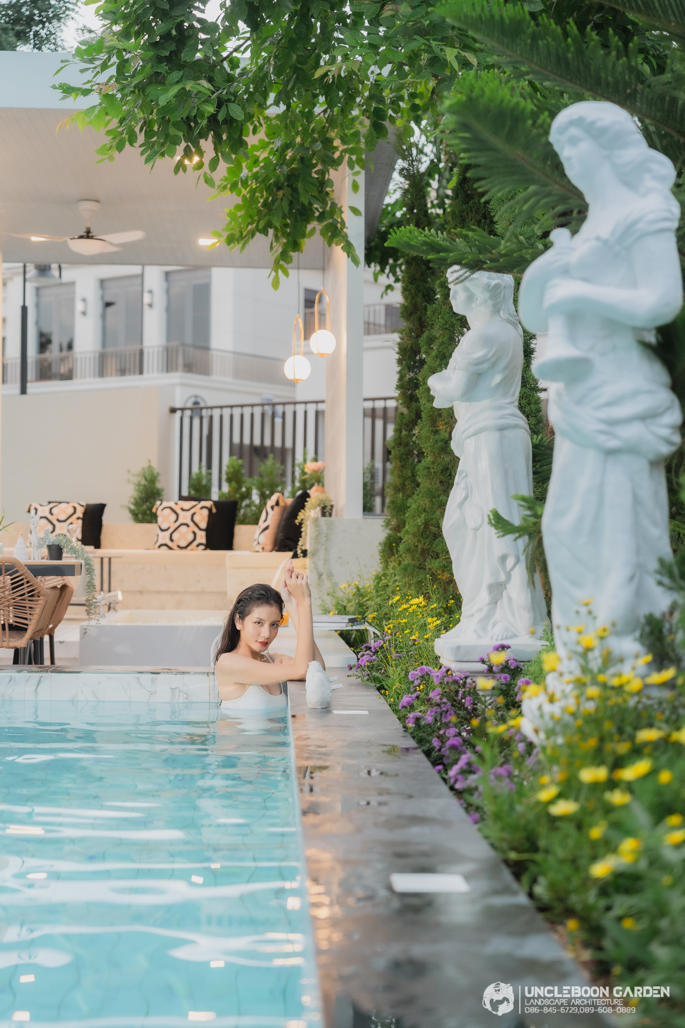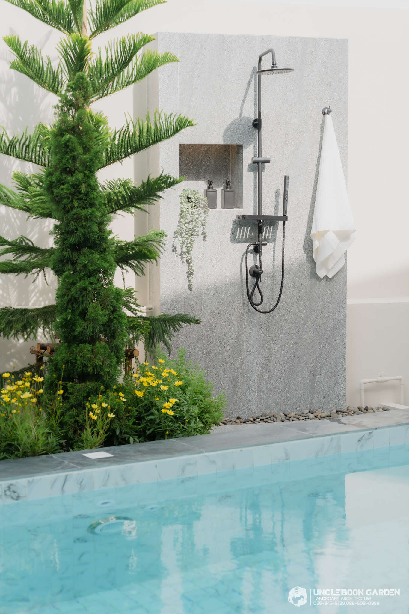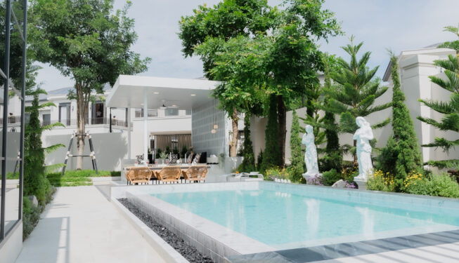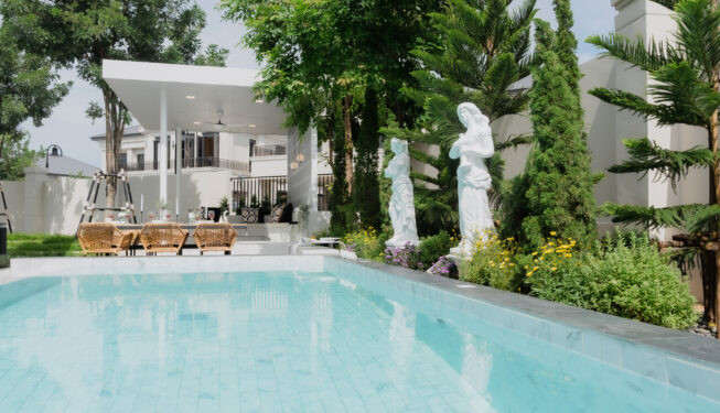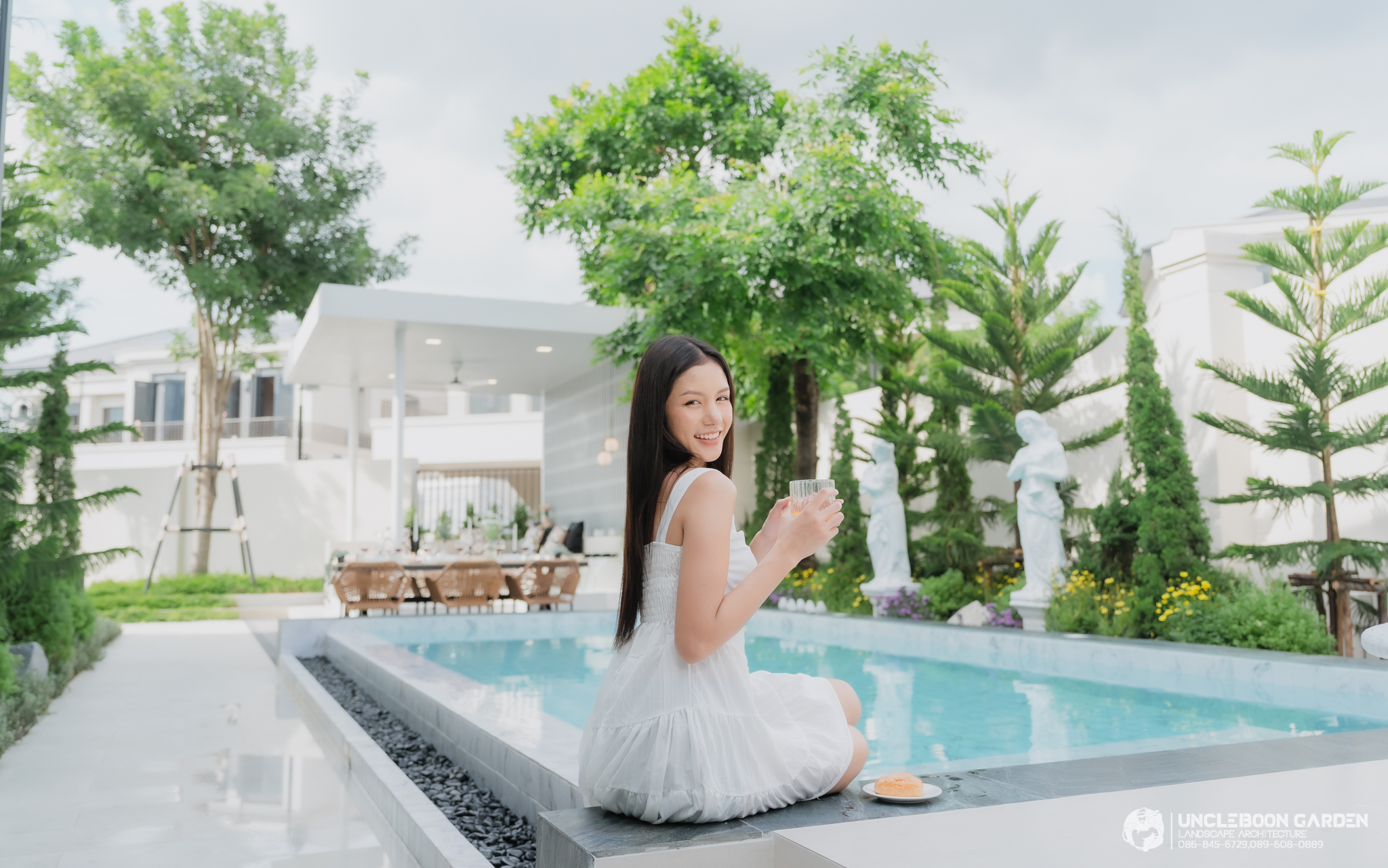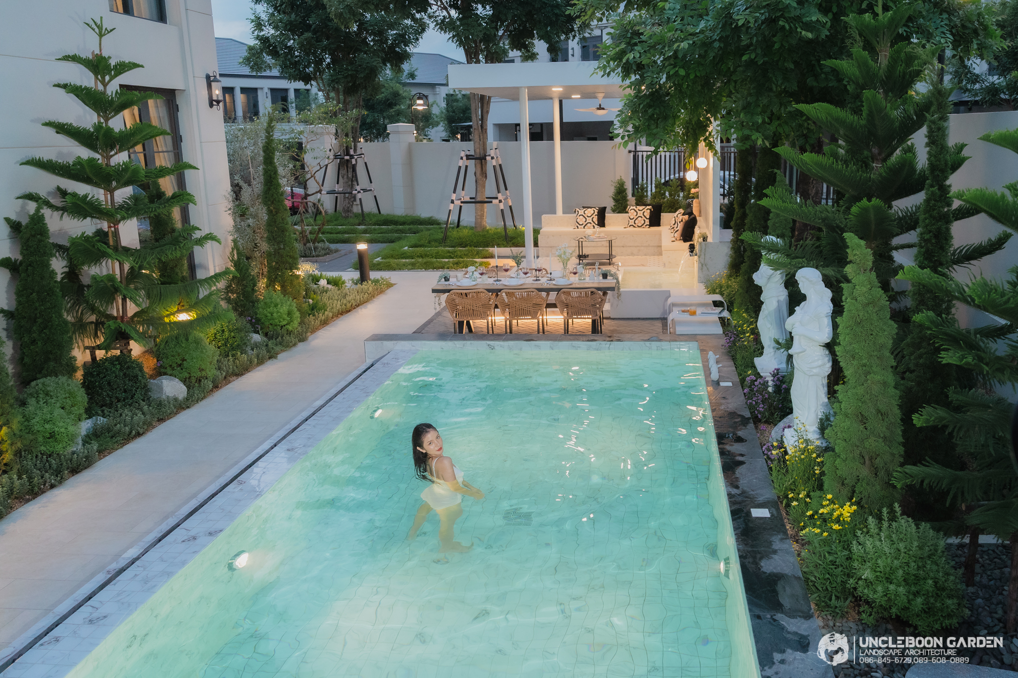 สระว่ายน้ำหินอ่อนถูกออกแบบเป็น จุดศูนย์กลางของสวน โครงสร้างใช้วัสดุหินอ่อนคุณภาพสูง เพิ่มความหรูหราและกลมกลืนกับธรรมชาติ พื้นผิวหินอ่อนสะท้อนแสงแดด สร้าง visual warmth และบรรยากาศที่ผ่อนคลาย น้ำสีฟ้าใสในสระสื่อถึง tranquility และความสงบ