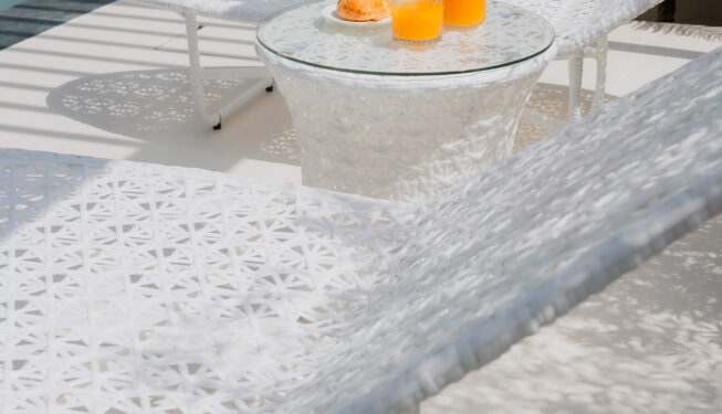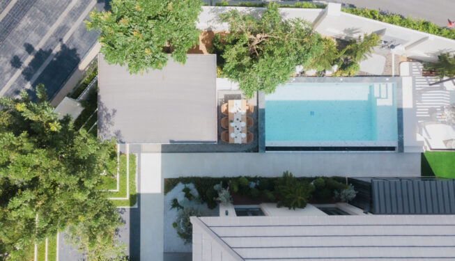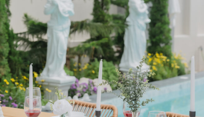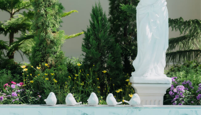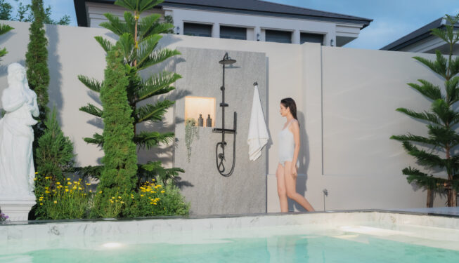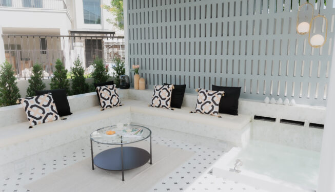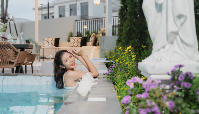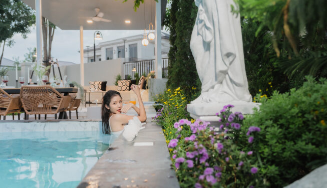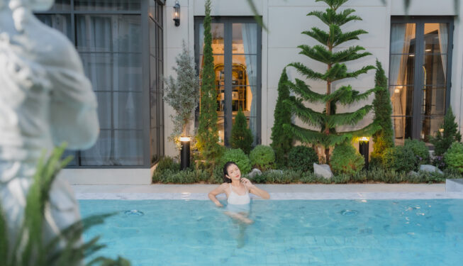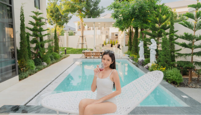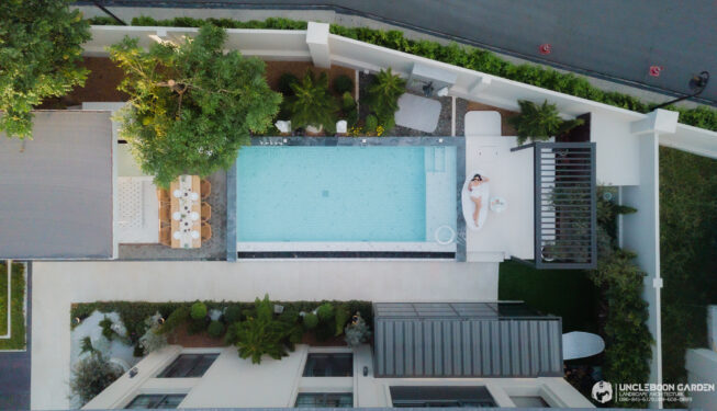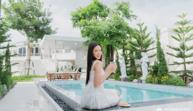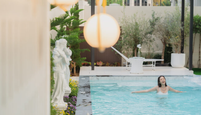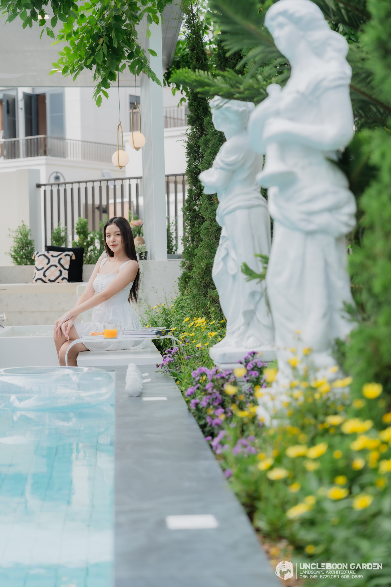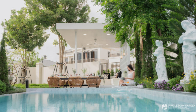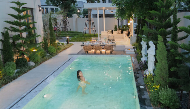 สระว่ายน้ำหินอ่อนถูกออกแบบเป็น จุดศูนย์กลางของสวน โครงสร้างใช้วัสดุหินอ่อนคุณภาพสูง เพิ่มความหรูหราและกลมกลืนกับธรรมชาติ พื้นผิวหินอ่อนสะท้อนแสงแดด สร้าง visual warmth และบรรยากาศที่ผ่อนคลาย น้ำสีฟ้าใสในสระสื่อถึง tranquility และความสงบ