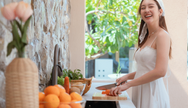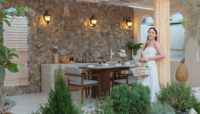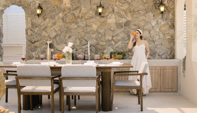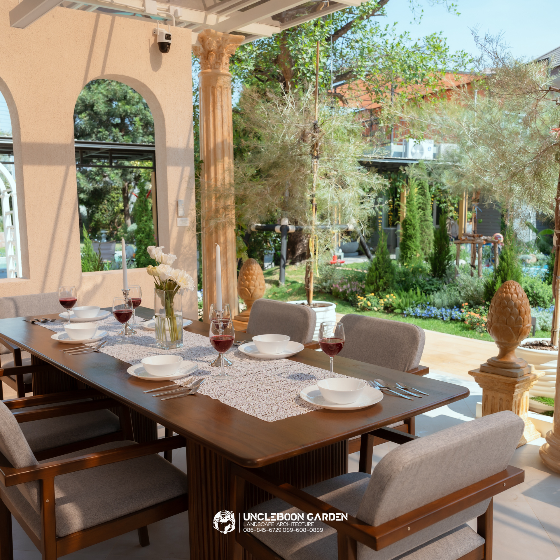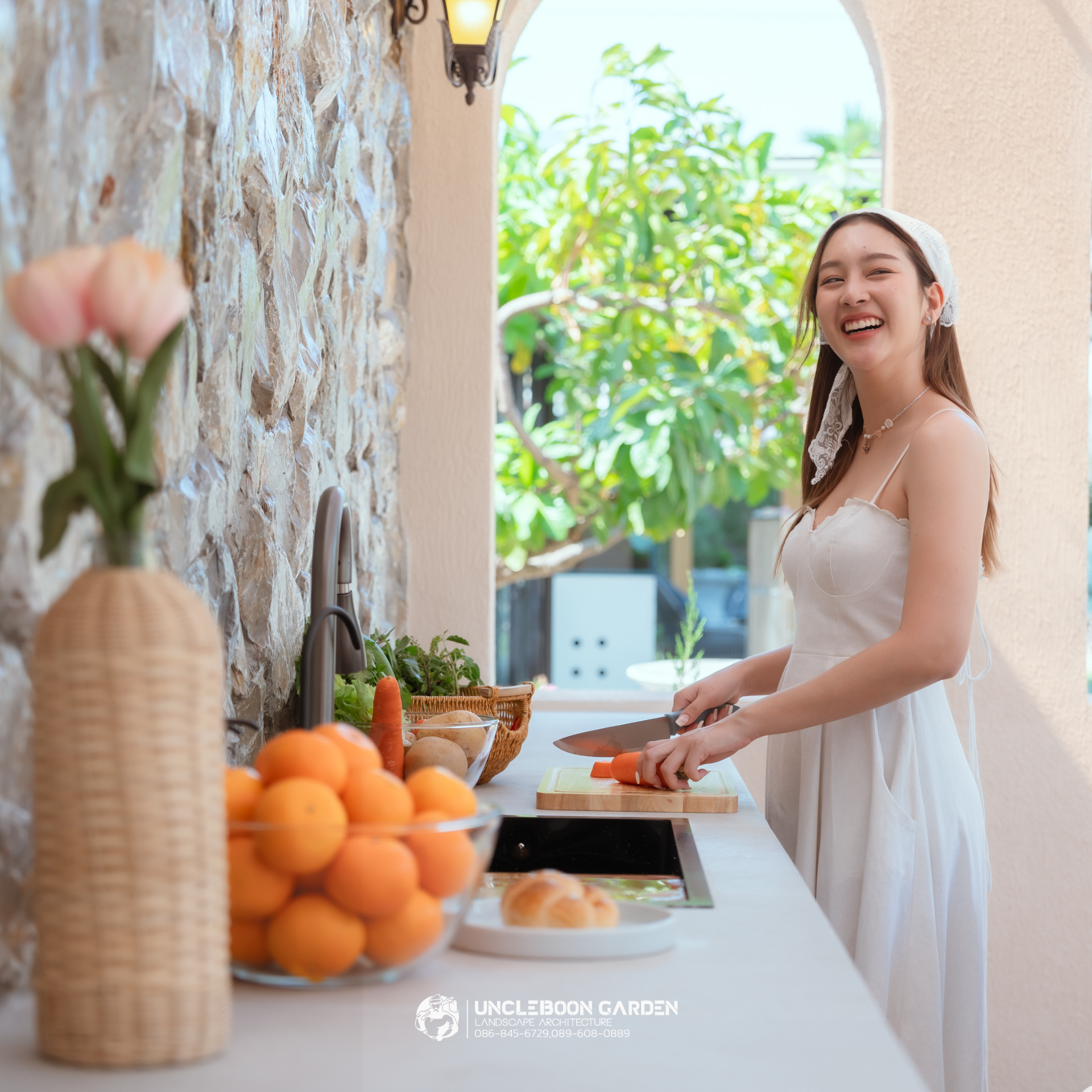 พื้นที่ครัวและรับประทานอาหารกลางแจ้งออกแบบให้มีความกลมกลืนกับธรรมชาติ ผสมผสาน terracotta tiles, rustic wooden tables และ wrought-iron lanterns เพื่อให้ได้บรรยากาศของ Tuscany-style al fresco dining