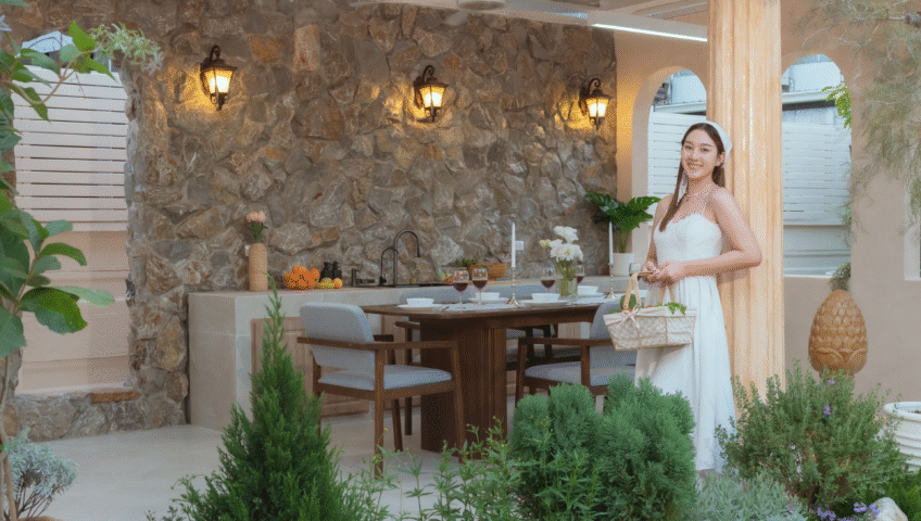 ยกระดับอีกนิดเพิ่มความชัดเจน ยกระดับพื้นที่นั่งส่วนกลางติดขอบบ่อน้ำ พื้นที่นี้จะสำคัญมาก ภายใต้โครงสร้าง จะมีระบบไฟ สาดขึ้นมา เป็นดาวไลท์ เล็กๆ เพิ่มความสวยงามของสวนในยามค่ำคืน เปิดปิดอัตโนมัติ เป็นรายละเอียดเล็กๆที่ทีมออกแบบซ่อนเอาไว้ มีบันได เชื่อมลงมาตรงทางเดินด้านข้างบ้าน สามารถเดินได้รอบบ้าน ไม้ที่มาทำเป็นไม้เทียมคอนวูด เราใช้วัสดุ เกรด Outdoor ทั้งหมด และสีที่น้ำมาเลือกใช้ ต้องไม่ผสมสารระเหยอันตราย เช่น โทลูอีน (toluene) เมื่อสูดดมเข้าไปจะส่งผลต่อระบบประสาท เกิดอาการมึนงง เวียนหัว คลื่นไส้ อาเจียนซึ่งเมื่อเวลาโดนแดดเผาต้องไม่มีสารที่เป็นอันตราย พัดเข้าบ้านลูกค้าอย่างแน่นอน