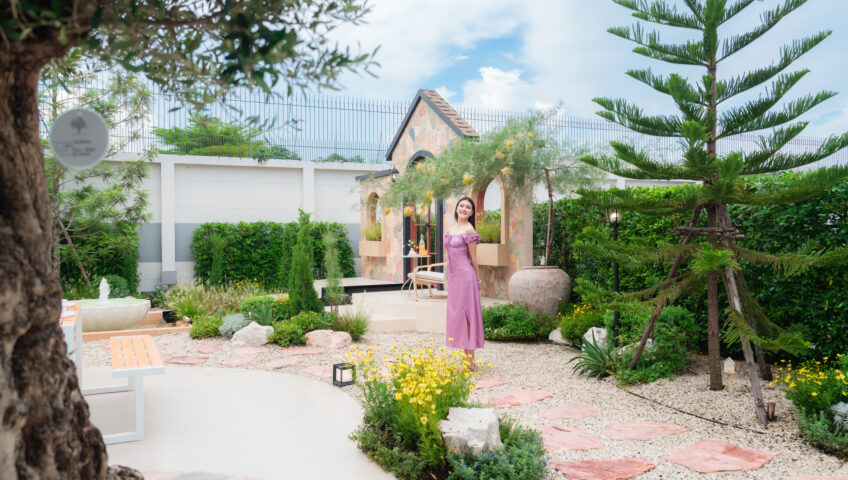 ในส่วนของ Softscape เลือกใช้พรรณไม้ที่รูปทรงกราฟฟิก อย่าง ต้นนีออน ไอริส และยี่โถแคระ ซึ่งไม้ดอกทั้งสองชนิดจะช่วยให้สวนมีสีสันได้เป็นอย่างดี